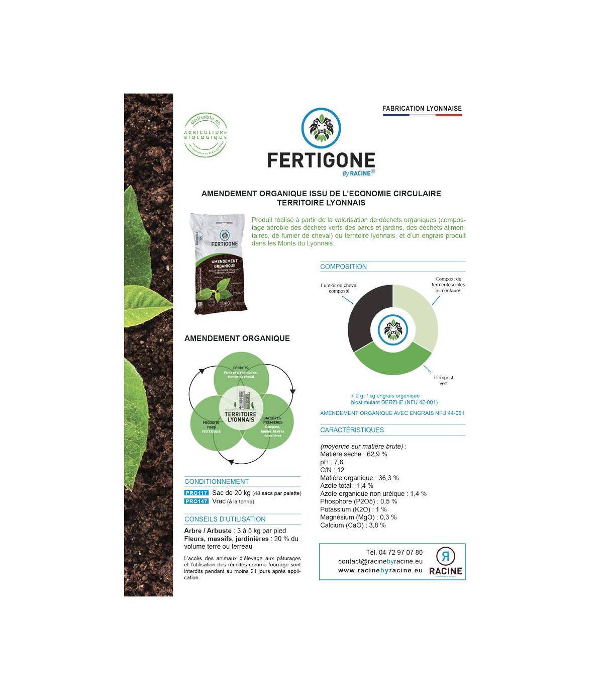 - Amendement organique FERTIGONE by RACINE prêt à l’emploi, fertilisant issu de la valorisation de déchets verts et alimentaires du territoire lyonnais.