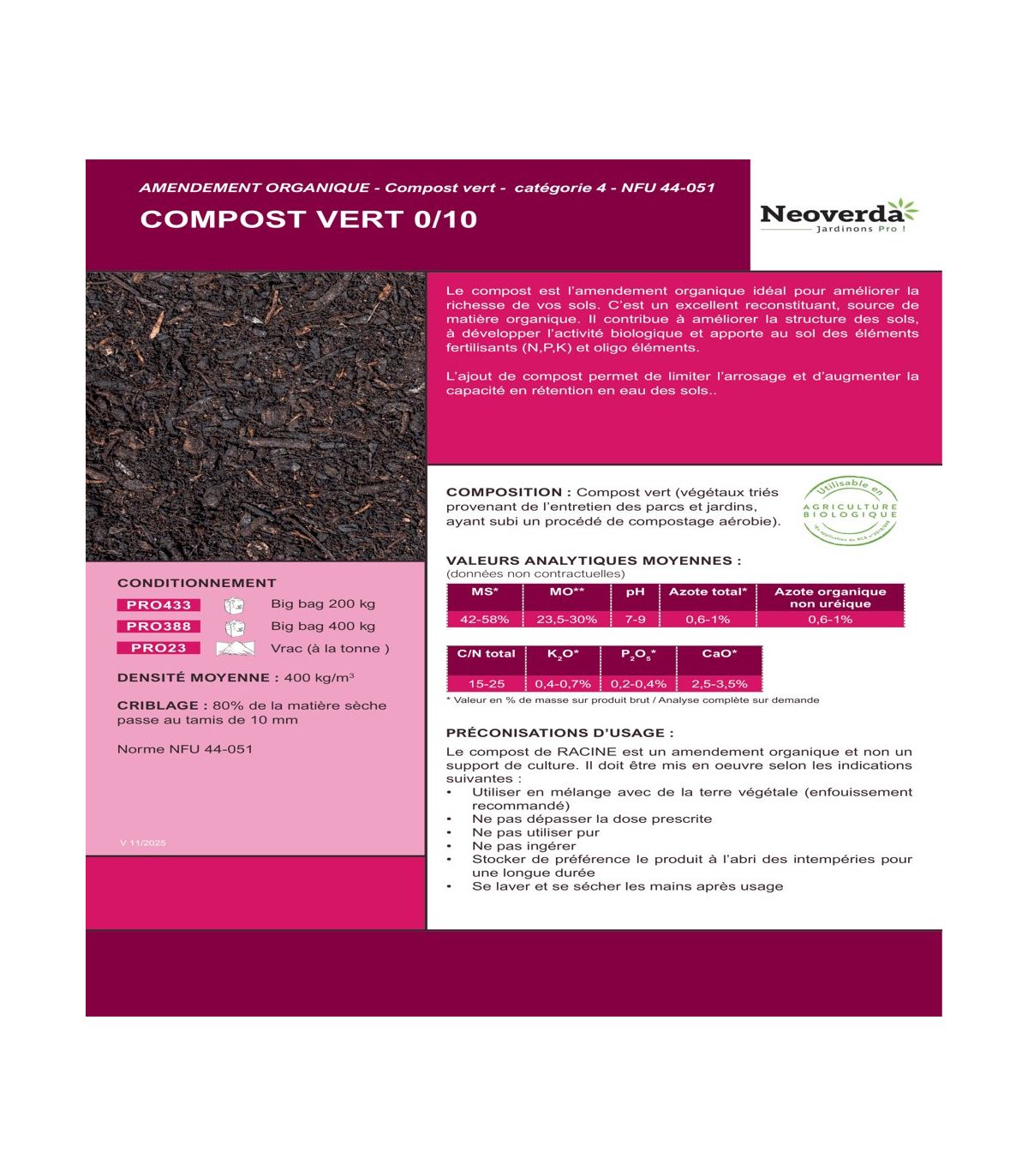 - Utilisable en Agriculture Biologique : composé exclusivement de végétaux triés (parcs et jardins).