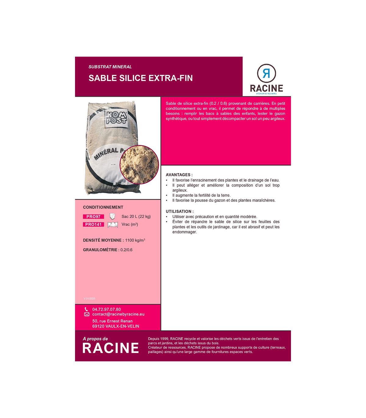 - Sable silice extra-fin RACINE PRO97, sable naturel de haute pureté pour le jardinage et l’aménagement.