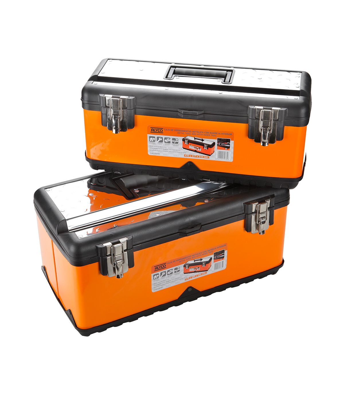 Pack de 2 boîtes de 470x217x210 et de 510x285x250 mm. Boîte à structure en métal et plastique avec plateau intérieur amovible. Avec une base en plastique renforcé, des parois métalliques et un couvercle à structure en plastique renforcé. Avec 2 serrures de sécurité en métal et un trou pour cadenas. Boîte de structure métallique avec renforts et rivets sur tous les bords. Couvercle avec partie métallique et poignée ergonomique pliable en plastique. Plateau intérieur en plastique qui s'adapte aux saillies de la boîte, pour couvrir les outils, et pour placer des outils ou des consommables dessus. Poignée en plastique. Livrées emboîtées l’une dans l’autre. Très utile pour le rangement et le transport de toutes sortes d'outils. Permet le stockage d'outils car peut être verrouillée. Très utile pour tous les travaux d'entretien, tant en atelier que pour l'entretien extérieur, les installations, les montages, etc.