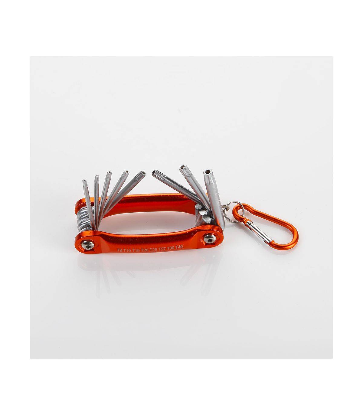 Set de 8 clés Torx inviolables. Les clés sont fabriquées en acier au chrome vanadium, trempé par traitement thermique avec une finition de surface chromée pour donner la meilleure dureté, la meilleure capacité de serrage, la meilleure protection contre la corrosion, et en bref une plus longue durée de vie. Les clés sont insérées dans un cadre en aluminium anodisé, où elles peuvent être dépliées. Le cadre permet une utilisation comme manche en T pour un couple de serrage supérieur. Cela permet un accès aux clés de manière pratique et simple, un meilleur rangement et une grande facilité de transport. Elles disposent également d'un anneau mousqueton à suspendre à la ceinture ou à un autre endroit. Mesures comprises : T9, T10, T15, T20, T25, T27, T30, T40.