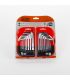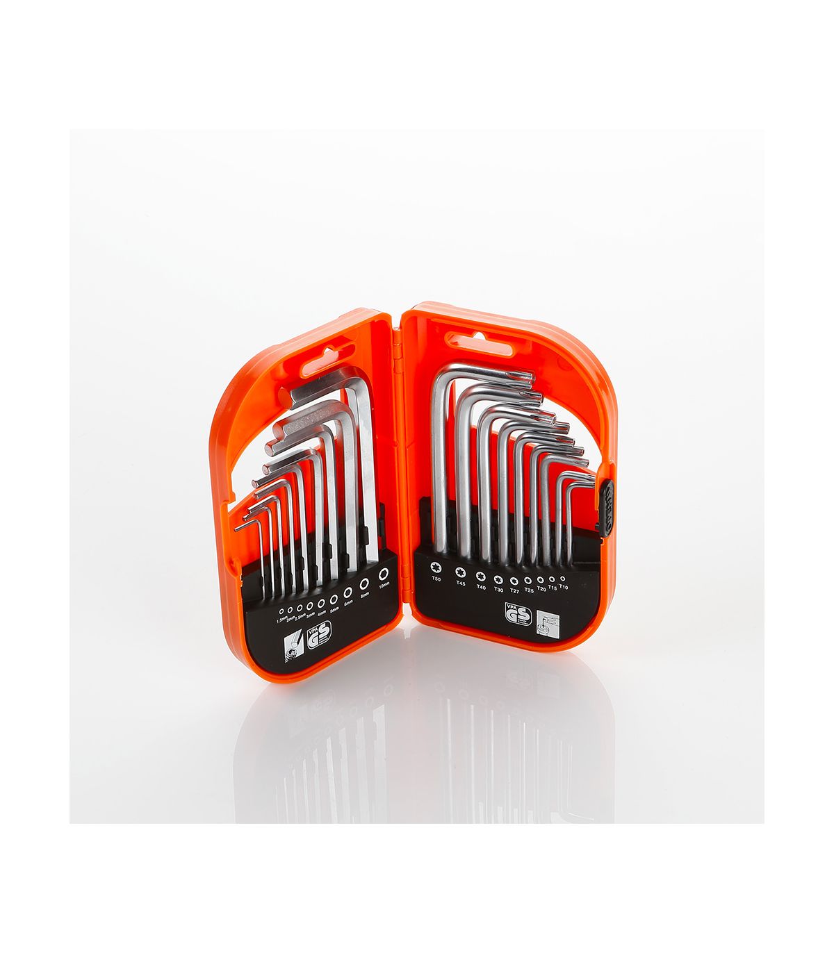 Set de 18 clés angulaires de série longue. L’étui comprend 9 clés Allen et 9 clés Torx inviolables. Les clés sont fabriquées en acier au chrome vanadium, trempé par traitement thermique avec une finition de surface chromée pour donner la meilleure dureté, la meilleure capacité de serrage, la meilleure protection contre la corrosion, et en bref une plus longue durée de vie. Il comprend un étui très confortable pour un accès facile et pratique aux clés, pour un rangement optimal, et très facile à transporter. Le support en plastique est également équipé d’un système d’accroche. Mesures comprises : Allen à boule 1,5 mm, 2 mm, 2,5 mm, 3 mm, 4 mm, 5 mm, 6 mm, 8 mm, 10 mm. Torx inviolable : T10, T15, T20, T25, T27, T30, T40, T45, T50. Cet ensemble est composé de clés conformes à la norme DIN 2936.