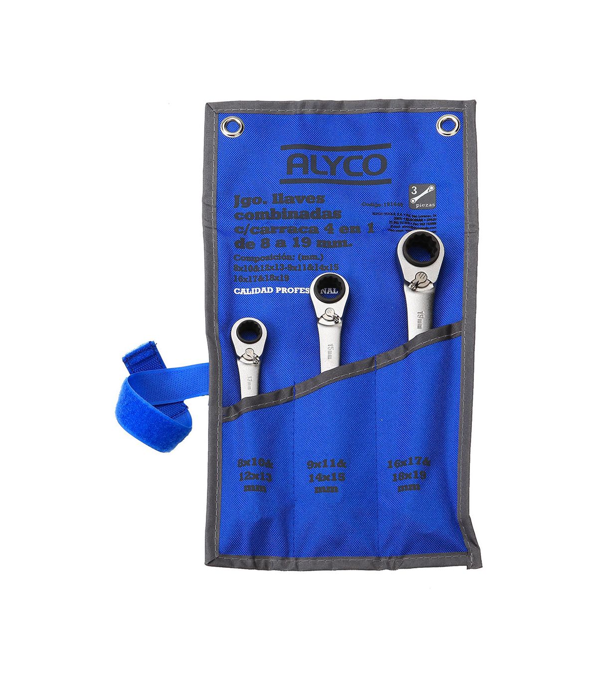 Set de 3 clés mixtes à double embout avec cliquet réversible dans un sac en nylon renforcé, avec 2 trous pour la fixation murale, des trous de rangement de taille différente pour chaque taille, ce qui permet de trouver rapidement les outils. Housse enroulable avec boucle de fermeture, pour un stockage et un transport faciles et confortables. Chaque mâchoire en étoile est compatible avec 2 mesures de réglage différentes (4 en 1) et les 12 bords sont arrondis. Fabriquée en acier chrome vanadium, forgée en une seule pièce, durcie par traitement thermique et traitée au chrome sur la surface pour éviter l'oxydation. Le cliquet réversible a 72 dents dentelées pour une durabilité exceptionnelle des dents. Sa finition par chromage satiné mat permet de combattre l’oxydation et la corrosion. Les têtes sont polies. Clé à deux mâchoires plates/étoile, avec un mécanisme à cliquet avec inverseur et des bords arrondis. Les procédés de fabrication confèrent à la clé une capacité de serrage supérieure à la norme DIN 3113, une élasticité qui empêche la casse pendant l'utilisation, pour une sécurité optimale, et une longue durée de vie grâce au traitement thermique et au chromage de la surface. Le mécanisme à cliquet a une configuration de 72 dents, de sorte que chaque pas est à un angle de 5 degrés, et possède une came qui permet de modifier le sens de rotation. La forme en étoile compte 12 côtés, permettant une utilisation avec des écrous à 6 et 12 côtés. Les mâchoires ont 2 tailles de serrage différentes selon la partie des mâchoires utilisée. Apparence : têtes polies et satiné mat. Dimensions (en mm) : 8x10- 12x13, 9x11- 14x15, 16x17- 18x19. Outil de serrage idéal pour les travaux industriels, mécaniques, de maintenance, de plomberie, d’assemblage, etc.