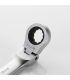 Clé mixte mâchoire plate/mâchoire étoile à cliquet réversible et à tête flexible. Les mors en étoile comptent 12 bords arrondis. Fabriquée en acier chrome vanadium, forgée en une seule pièce, durcie par traitement thermique et traitée au chrome sur la surface pour éviter l'oxydation. Le cliquet réversible a 72 dents dentelées pour une durabilité exceptionnelle des dents. L'inclinaison de 15º de la tête est adaptée pour accéder aux lieux de travail difficiles. Sa finition par chromage satiné mat permet de combattre l’oxydation et la corrosion. Les têtes sont polies. Clé à double mâchoire et à anneau avec mécanisme à cliquet et mécanisme d'inversion, avec bords arrondis. La tête avec cliquet est articulée et peut être tournée de 180°. Les procédés de fabrication confèrent à la clé une capacité de serrage supérieure à la norme DIN 3113, une élasticité qui empêche la casse pendant l'utilisation, pour une sécurité optimale, et une longue durée de vie grâce au traitement thermique et au chromage de la surface. Le mécanisme à cliquet a une configuration de 72 dents, de sorte que chaque pas est à un angle de 5 degrés, et possède une came qui permet de modifier le sens de rotation. La forme en étoile compte 12 côtés, permettant une utilisation avec des écrous à 6 et 12 côtés. L’articulation flexible permet de serrer dans les endroits difficiles d'accès. Apparence : têtes polies et satiné mat. Mâchoire chanfreinée et étoiles à bords arrondis pour un emboîtement facile de l'écrou. L’angle de 15° de la mâchoire plate permet d’accéder aux endroits difficiles. La mâchoire en étoile est articulée jusqu'à 90° dans chaque direction autour de l'axe du manche, ce qui permet d’accéder à des endroits difficiles. Outil de serrage idéal pour les travaux industriels, mécaniques, de maintenance, de plomberie, d’assemblage, etc.
