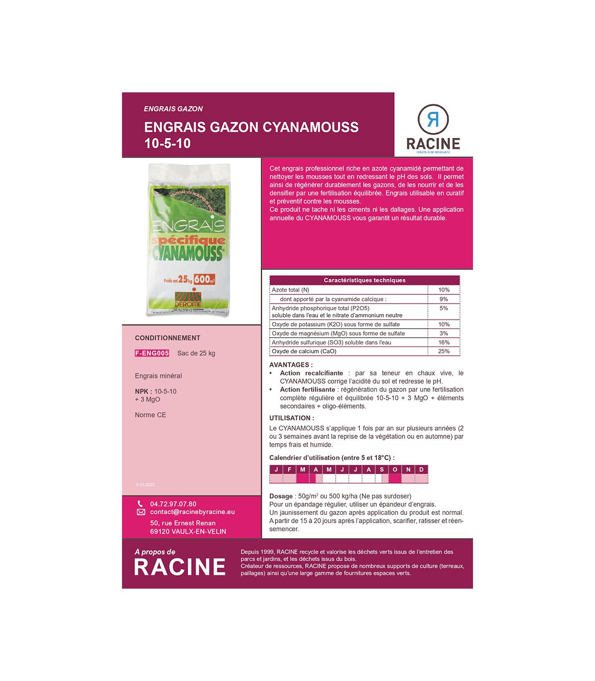 - Granulométrie régulière permettant un épandage précis et une pénétration rapide dans le sol après arrosage.