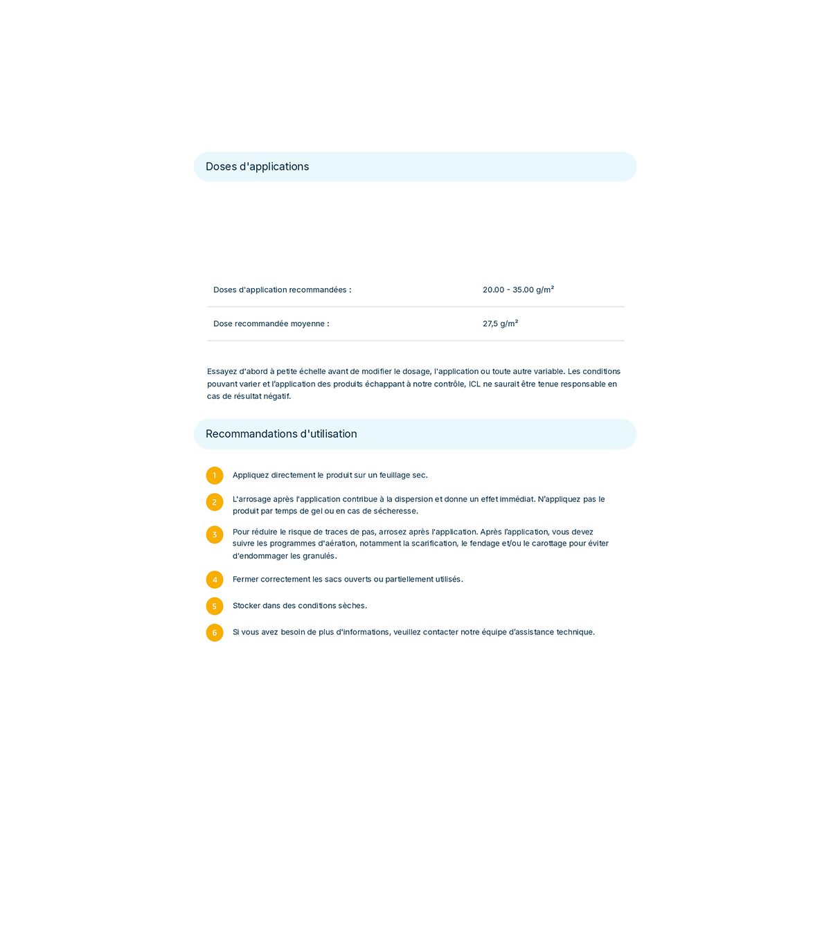 Le produit ne doit pas être utilisé en cas de gel ou de sécheresse extrême. Veillez à bien refermer le sac après usage et à le stocker dans un endroit sec pour éviter l'agglomération des granulés. Grâce à sa haute concentration en éléments nutritifs, une faible dose suffit pour un résultat spectaculaire. En suivant ces conseils d'usage, vous offrez à votre propriété un aspect soigné et luxueux. C'est le support de nutrition idéal pour les propriétaires souhaitant le meilleur pour leur extérieur, alliant robustesse végétale et esthétique irréprochable. Sa qualité ICL est reconnue par les intendants de golfs du monde entier.