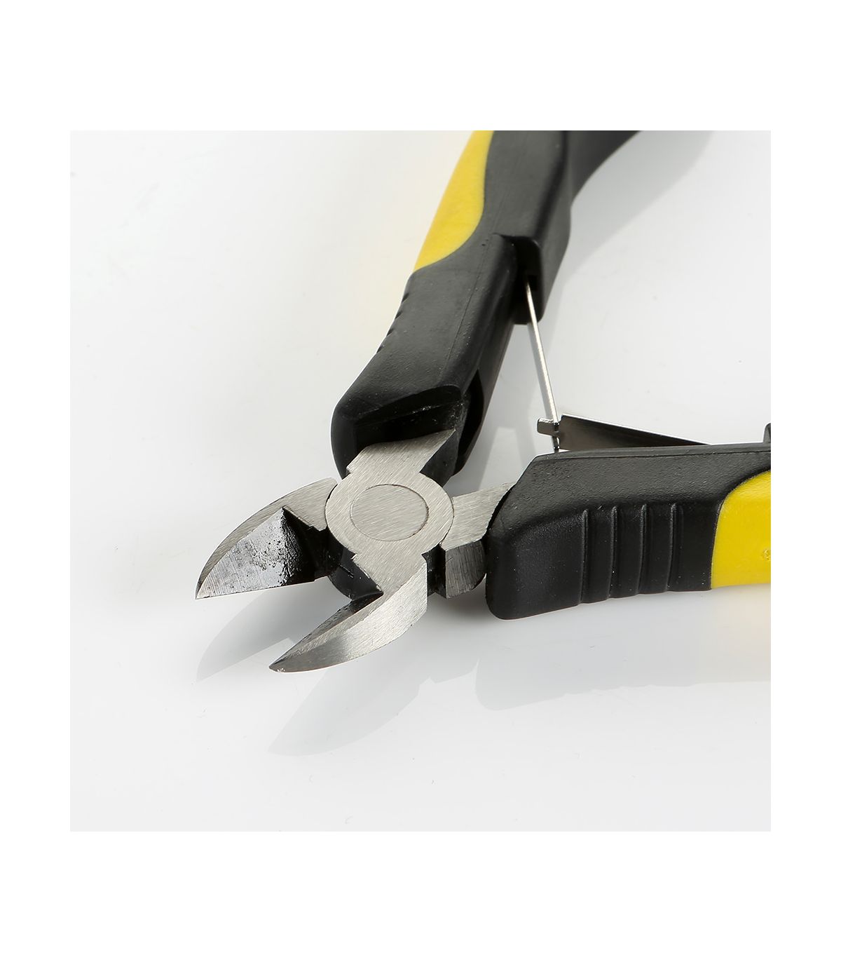 Mini pince à coupe diagonale pour l'électronique ESD avec poignées dissipatrices d'électricité statique pour une grande durabilité, une coupe précise sur une longue durée et confortable même en cas d'utilisation intensive et répétitive. Mini pince avec poignées ESD pour effectuer des tâches de coupe dans les travaux d'électronique. La zone de coupe comporte des tranchants pour la découpe de matériaux durs et semi-durs. Cette pince coupante est fabriquée en acier au chrome vanadium et est très résistante à l'usure. En outre, son corps est traité thermiquement pour lui donner une plus grande dureté et les bords tranchants sont trempés par induction pour une meilleure capacité de coupe et prévenir l’usure. La poignée est composite, ce qui la rend facile à saisir et confortable à utiliser, et est conçue avec des composants en plastique pour dissiper l'électricité statique. Ressort doux pour une ouverture et fermeture des pinces fermes et régulières. Fonctionnalités de coupe pour les matériaux durs et semi-durs.