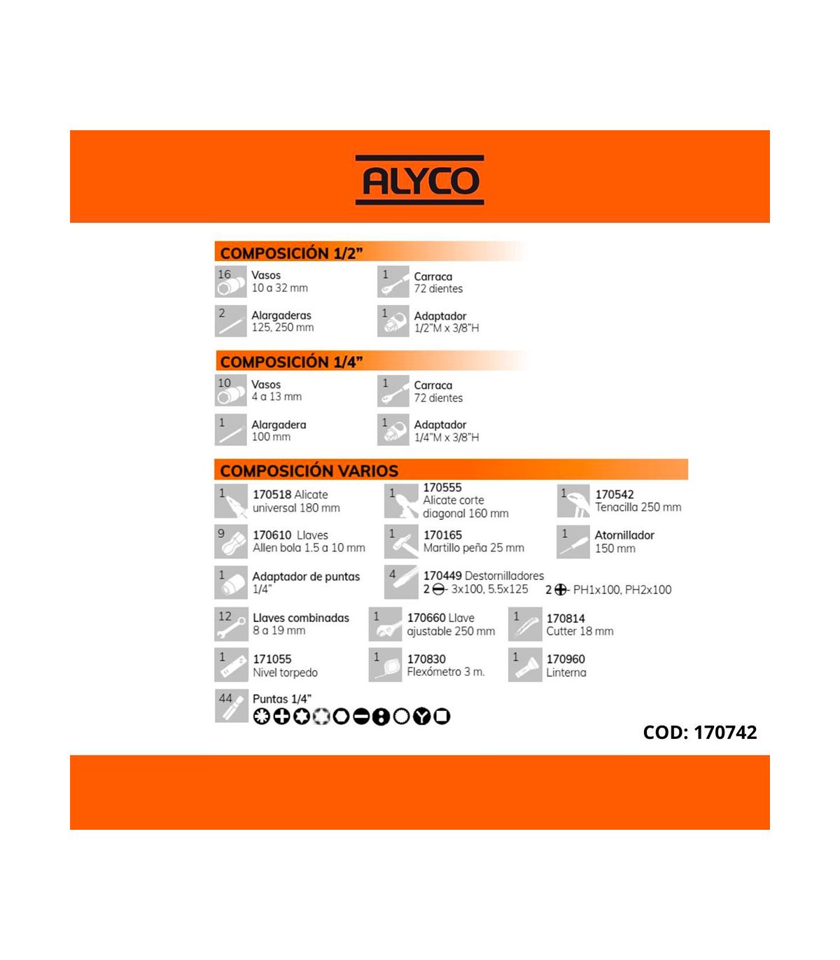 Ensemble combiné dans une mallette en plastique qui facilite son stockage et son transport. Parfait pour tous les travaux de mécanique ou de bricolage. Conforme aux normes de produits DIN, il est parfait pour l'industrie, l’assemblage, le personnel de maintenance, etc. Tous les sets combinés ALYCO ORANGE ont une grande résistance à l'usure. Les outils et accessoires sont chromés pour une protection optimale contre la rouille et la corrosion. Comprend un boîtier en plastique avec des compartiments à l'intérieur pour chaque accessoire ou outil. Dans la partie inférieure visible de chaque emplacement, vous pouvez voir la taille de chaque accessoire pour un rangement ordonné, facile et rapide. De plus, la charnière centrale est également renforcée, pour mieux résister aux chocs et ne pas casser à l'usage. L'étui comprend -Composition ½" : 16 douilles (10 à 32 mm) / 1 cliquet réversible avec éjecteur de douilles 72 dents / 2 rallonges (125, 250 mm) / 1 adaptateur (½"M x 3/8 "H). -Composition ¼" : 10 douilles (4 à 13 mm) / 1 cliquet réversible avec éjecteur de douilles 45 dents / 1 rallonge (100 mm) / 1 adaptateur de douilles (¼"M x 3/8 "H). -Composition pinces : 1 pince universelle 180 mm / 1 coupeur diagonal 160 mm / 1 paire de pinces 250 mm. -Composition de clés à douille hexagonales à bouts sphériques : Set de 9 pièces de 1,5 à 10 mm. -Composition des clés ouvertes et à étoile : 12 pièces de 8 à 19 mm. -Composition tournevis : 2 embouts plats, 2 embouts Phillips PH. -Composition des embouts de tournevis : Set de 44 pièces d'embouts 1/4" avec plat, PH, PZ, Torx, hexagone, robertson, triwing, spline. -Plus : 1 clé à molette de 250 mm, 1 cutter de 118 mm, 1 marteau de 25 mm, 1 tournevis de 150 mm, 1 niveau torpille, 1 mètre ruban de 3 m, 1 chalumeau et 1 adaptateur pour embouts 1/4".