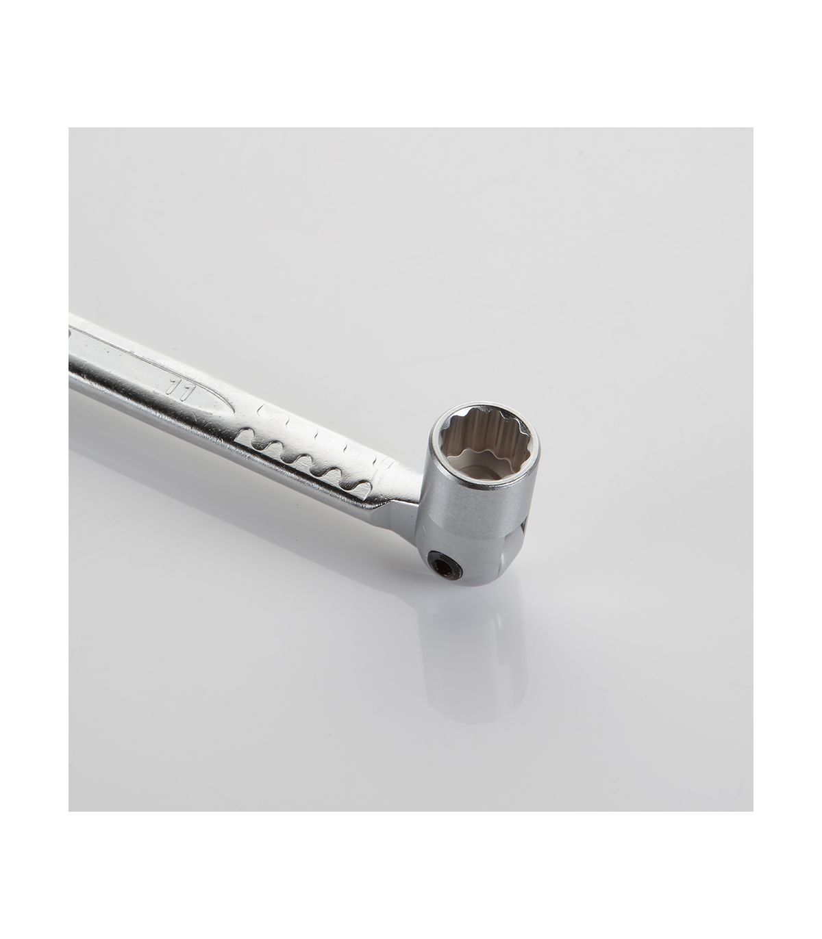 Clé pour le serrage des écrous à 6 et 12 pans, avec deux tailles d'utilisation.Clé fabriquée en acier au chrome-vanadium, ce qui lui confère une longue durée de vie et une grande résistance aux contraintes.Forgée et durcie par traitement thermique, ce qui lui confère une plus grande longévité et une meilleure résistance aux contraintes. Chromage superficiel extérieur pour éviter la rouille.Possibilité de serrer dans les endroits difficiles d'accès grâce à son articulation.Outil de serrage idéal pour les travaux automobiles, industriels, mécaniques, de maintenance, de plomberie, d’assemblage, etc.