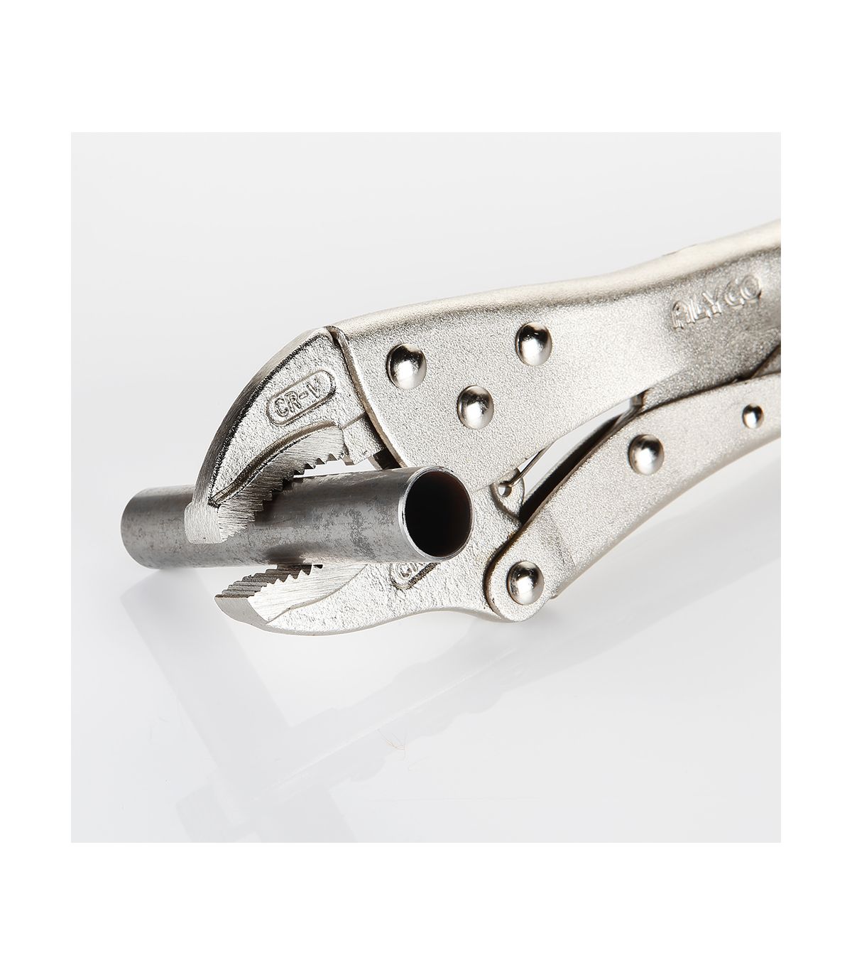 Pince à serrer pour le serrage de pièces ou de surfaces pour le collage, le soudage ou d'autres opérations nécessitant l'immobilisation des pièces pour le travail ou la manipulation. Étau verrouillable dont les mâchoires sont en acier au chrome-vanadium, ce qui donne une grande capacité de prise et une longue durée de vie à l’outil. Les mâchoires sont forgées et traitées thermiquement par induction. Ces mâchoires ont un intérieur incurvé avec des rainures pour saisir des pièces ovales ou cylindriques avec une prise sûre et ferme. Ces mâchoires ont une grande ouverture, permettant une prise de grande capacité. Les mâchoires ont une partie interne avec des bords tranchants pour couper les fils. Les mâchoires et les poignées sont rivetées ensemble. Sur les poignées se trouve un écrou permettant de régler l'ouverture des mâchoires. Sur l'autre poignée se trouve un levier permettant de bloquer la pince à la pression et à l'ouverture souhaitées, libérant ainsi les mains pour effectuer des opérations sur les pièces saisies. Cet étau verrouillable est adapté aux pièces rondes. Très utile dans les ateliers industriels, la plomberie, le chauffage, les opérations de collage et de soudage, etc.