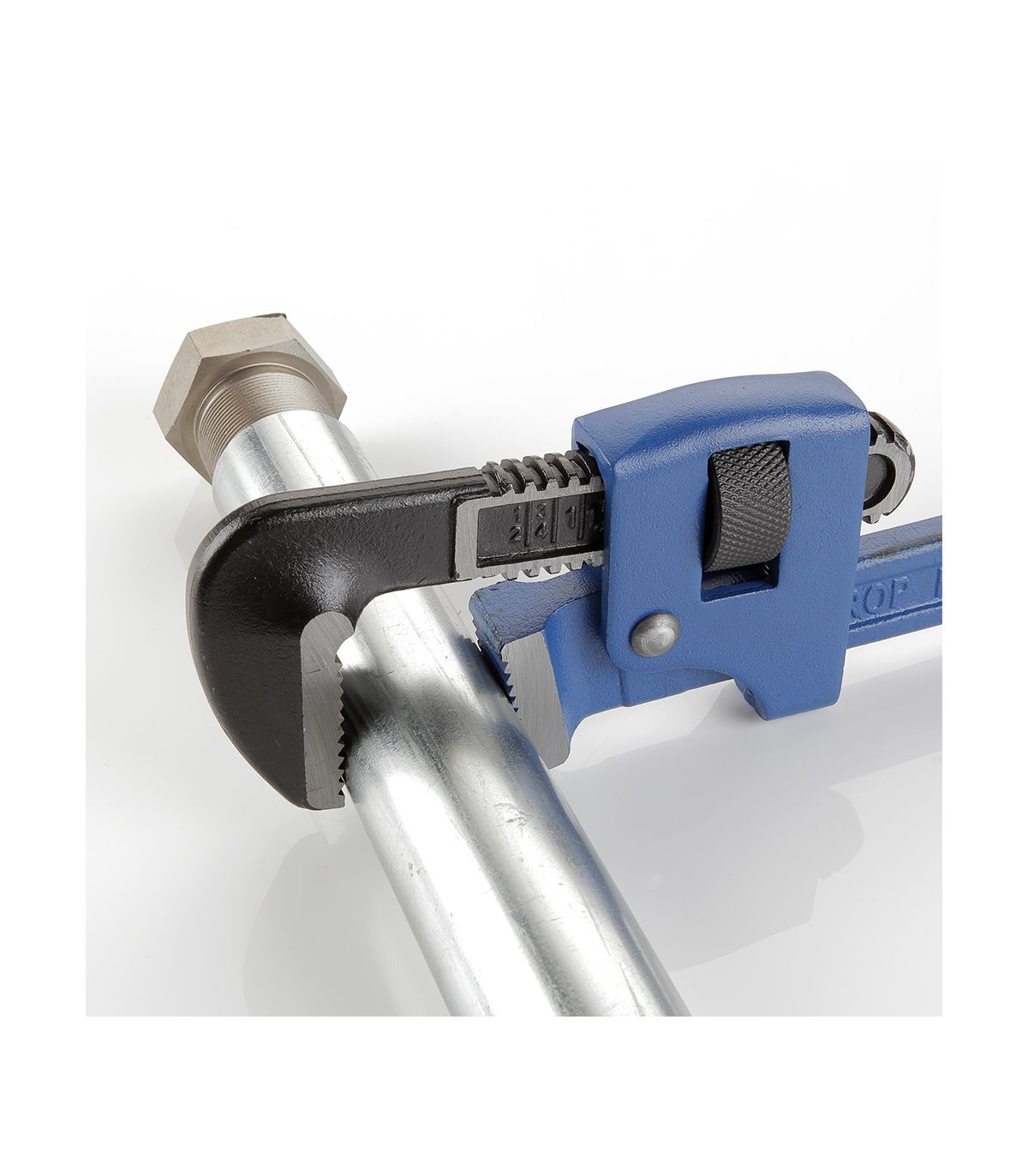Clé Stillson fabriquée en acier forgé. Manche en acier avec double profil en T pour une bonne prise en main et une très longue durée de vie de la clé, même en utilisant des extensions pour plus de levier. L'extrémité dentelée du manche est durcie par induction à 60 HRC, ce qui lui confère une résistance à la traction et une capacité de serrage élevées. La tête, ou mâchoire mobile, a une dureté par induction de 45 HRC et la partie dentelée en contact avec le tube est trempée par induction jusqu'à 60 HRC, ce qui lui confère une très longue durée de vie et une excellente capacité de préhension, et permet une prise en main et une transmission des efforts très efficaces. À cela s’ajoute une sécurité d’utilisation très importante. La crémaillère de réglage est conçue pour éviter tout désalignement accidentel. La pièce de liaison est renforcée pour éviter tout perte d'efficacité dans la transmission de l'effort, et est équipée d’un rivet spécial. Le manche abrite également la molette de verrouillage et de déverrouillage de la clé, avec un mécanisme qui, une fois réglé, ne fait pas bouger accidentellement l'ouverture. La tête, la pièce de liaison et le manche sont peints pour empêcher à la graisse et à la saleté d’adhérer. Dispose d’un écrou de réglage et d’une mâchoire de rechange. Clé très adaptée au serrage et à la manipulation de tuyaux en acier, notamment dans les domaines de la plomberie, de la pétrochimie, des oléoducs ou d'autres types de pipelines. Idéale pour les activités industrielles, de plomberie et de maintenance.