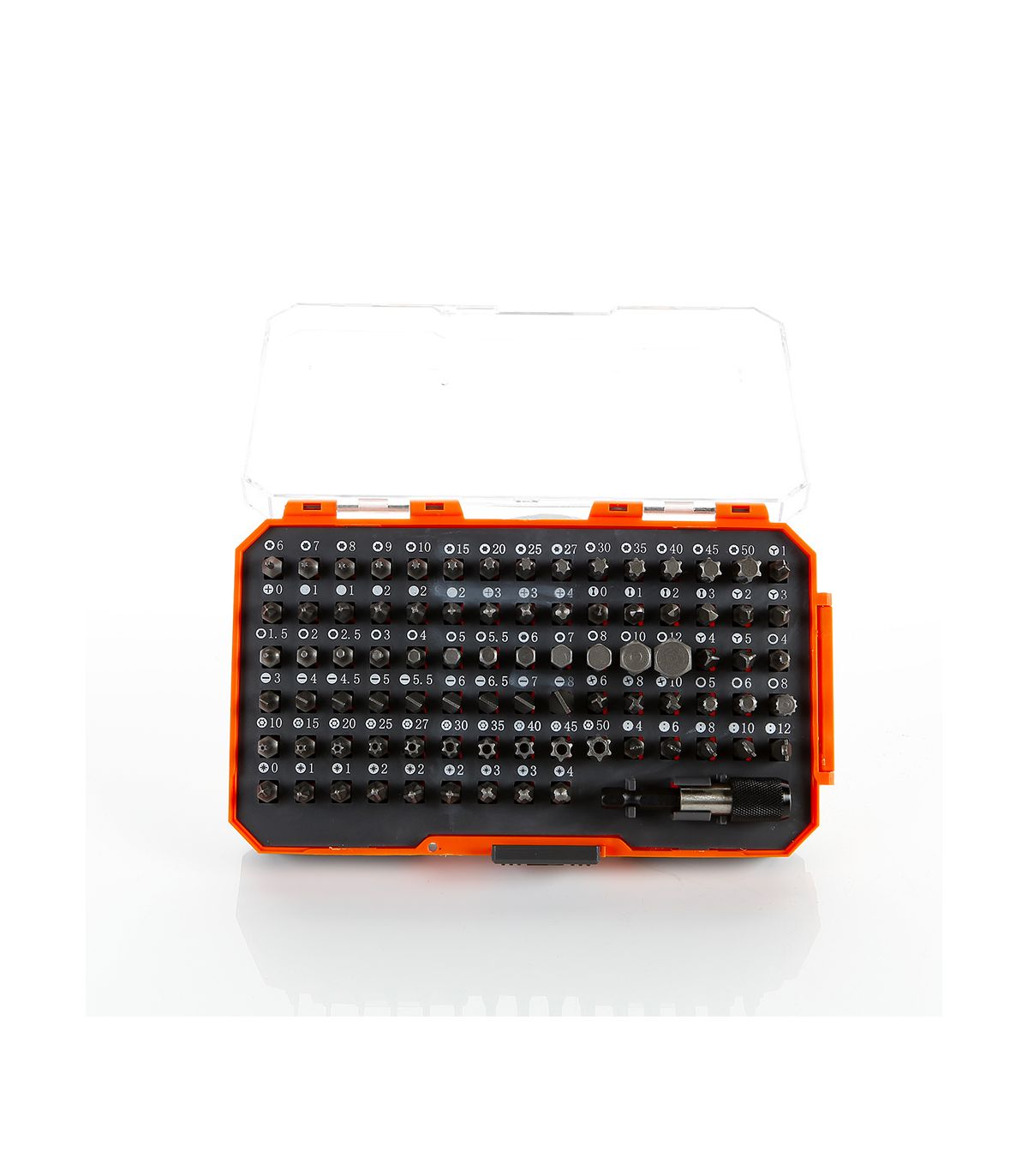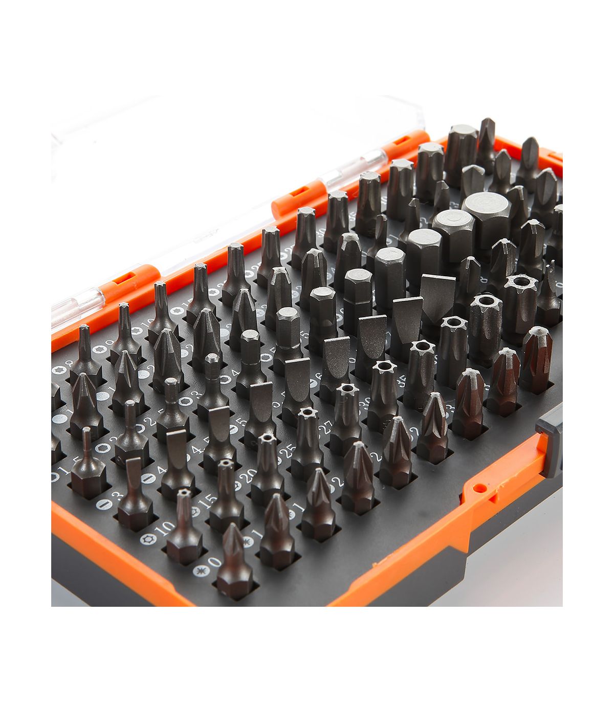 Set de 84 embouts de tournevis 1/4" plats, PH, PZ, TX, Triwing, Spline, Spanner, Mortorq et Clutch avec adaptateur d'embouts. Les embouts de tournevis sont fabriqués en acier au chrome vanadium et durcis par traitement thermique. Le boîtier est petit, compact et très résistant aux chocs. Les embouts sont insérés dans les douilles afin qu'ils ne puissent pas tomber accidentellement. Composition : Pointe plate : 3, 4, 4,5, 5, 5,5, 6, 6,5, 7, 8 mm. Phillips PH : PH0, PH1 (2), PH2 (3), PH3 (2), PH4. Pozidrive PZ : PZ0, PZ1 (2), PZ2 (3), PZ3 (2), PZ4. Torx : T6, T7, T8, T9, T10, T15, T20, T25, T27, T30, T35, T40, T45, T50. Torx de sécurité : T10, T15, T20, T25, T27, T30, T35, T40, T45, T50. Hexagonal : 1,5, 2, 2,5, 3, 4, 5, 5,5, 6, 7, 8, 10, 12 mm. Clutch : 0, 1, 2, 3. Triwing : 1, 2, 3, 4, 5. Spanner : 4, 6, 8, 10, 12. Spline : 4, 5, 6, 8. Mortorq : 6, 8, 10. Set d'embouts utiles pour un large éventail de tâches de serrage, avec cliquet et adaptateur, manche de tournevis, etc. Très utile en mécanique, électronique, bricolage, maintenance, installateurs, etc.