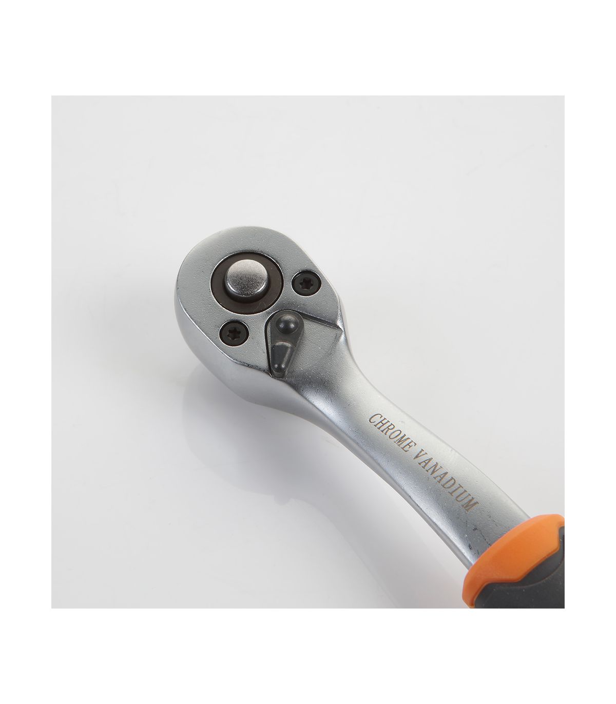 Clé à douille avec entraînement carré de 1/4" en acier chrome vanadium, avec traitement thermique et chromage de surface et mécanisme de rotation à 72 dents, avec un pas tous les 5 degrés, ce qui lui permet d'avoir un maximum de précision. Le cliquet dispose d'un inverseur et d'un éjecteur de douille, ce qui lui confère une très grande fiabilité et capacité de serrage. Élément de serrage multifonctionnel, avec possibilité de serrage à droite et à gauche. Entraînement carré très précis, qui s'adapte parfaitement à la clé à douille, avec une boule de retenue pour empêcher la douille de se séparer ou de tomber. Manche ergonomique composite. Parfait pour les serrages en mécanique, maintenance, assemblage, etc.