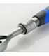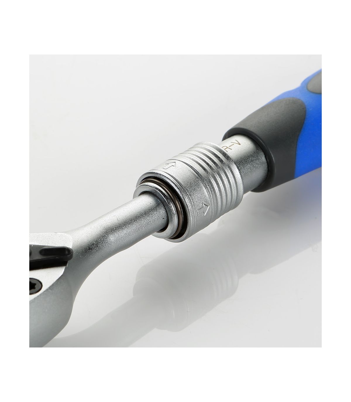 Clé à cliquet pour serrage avec douilles carrées mâles de 1/4". Ces clés à cliquet sont fabriquées en acier au chrome vanadium, ce qui leur confère une plus grande résistance, une meilleure capacité de serrage et une plus longue durée de vie. La partie métallique des cliquets est traitée thermiquement au cours du processus de fabrication, ce qui leur confère une plus grande capacité de serrage, évite les fissures et prolonge leur durée de vie utile. À la fin du processus de fabrication, elles subissent un traitement de surface par chromage, qui prévient la corrosion et prolonge leur durée de vie. Les clés à cliquet permettent de serrer avec des clés à douille de 1/4". Conforme aux normes DIN3122 et ISO3315. Le cliquet possède un mécanisme de rotation de 72 dents, de sorte que chaque pas de rotation est de 5 degrés de circonférence, ce qui détermine un serrage fin et précis. Il est doté d'une manette permettant de changer le sens de rotation, ce qui le rend très pratique pour les serrages avec un petit angle de rotation ou dans les espaces confinés. Cette polyvalence est encore renforcée par la poignée extensible qui permet d'exercer un couple plus important au fur et à mesure que la poignée est allongée ou de travailler dans des espaces difficiles d'accès. La poignée peut être étendue en 6 positions préréglables entre 150 et 200 mm. La poignée ergonomique composite permet d'exercer une force maximale sans fatigue de la main, même lors de serrages intensifs et répétitifs. Le cliquet permet un serrage très précis avec une transmission de force élevée, sans user la clé à douille, qui est parfaitement adaptée à l'entraînement carré mâle du cliquet. La bille à ressort de l'entraînement carré s'insère dans un évidement de la douille pour éviter que celle-ci ne tombe accidentellement et pour garder l'autre main libre. Lorsque l'éjecteur est actionné, la bille se rétracte et permet de retirer facilement la douille. Le serrage à cliquet peut être étendu avec une barre d'extension, une barre d'extension flexible et un joint universel. Peut être utilisé avec un adaptateur d'embout de tournevis pour une utilisation avec des embouts. Durable, résistante à la corrosion, poignée antidérapante, couple important, adaptée à une longue durée de travail. Largement utilisée pour fixer ou démonter les boulons à tête hexagonale, les écrous. Très approprié pour le serrage des écrous dans l'industrie, la construction, la maintenance industrielle et même l'usage domestique.