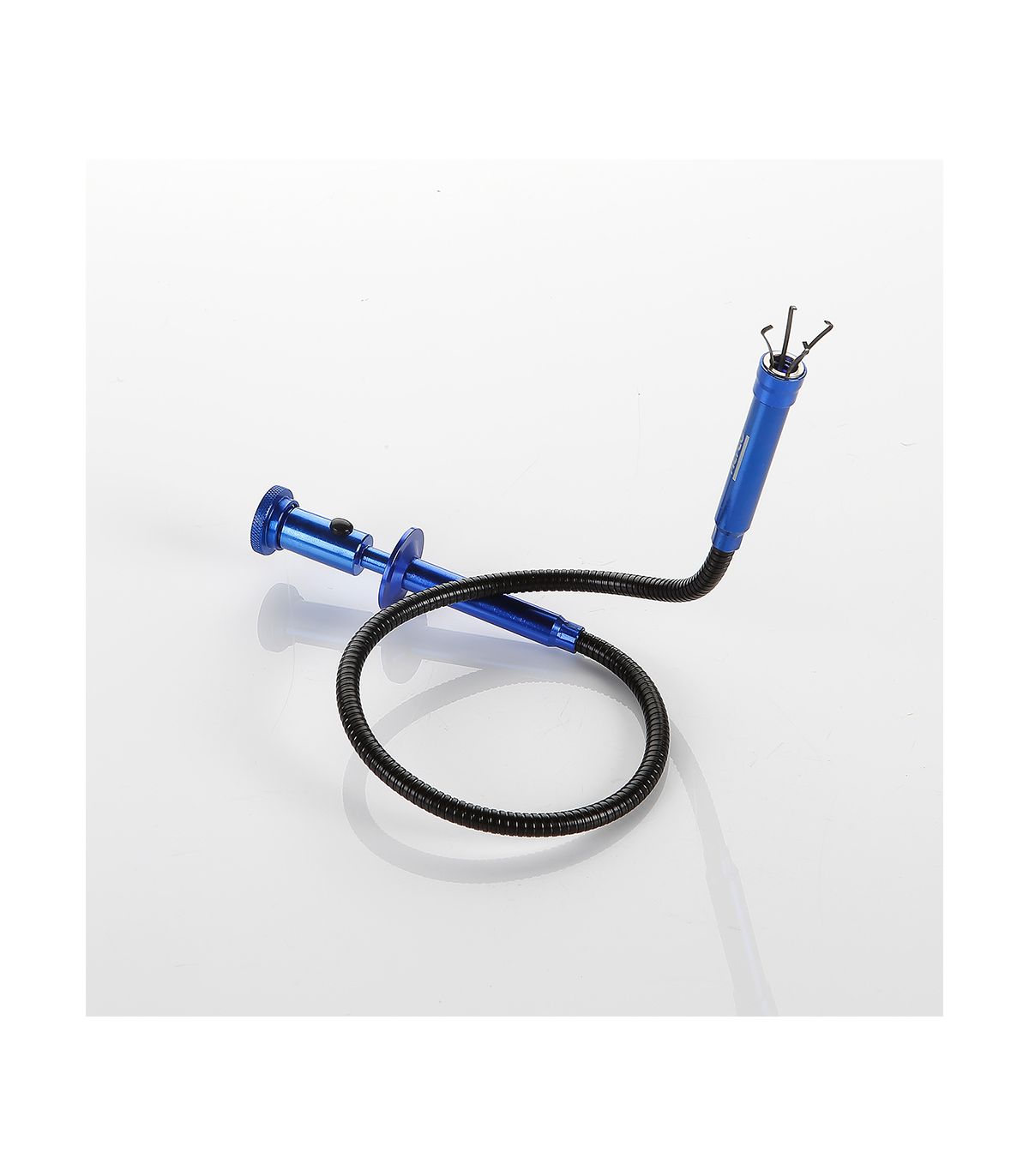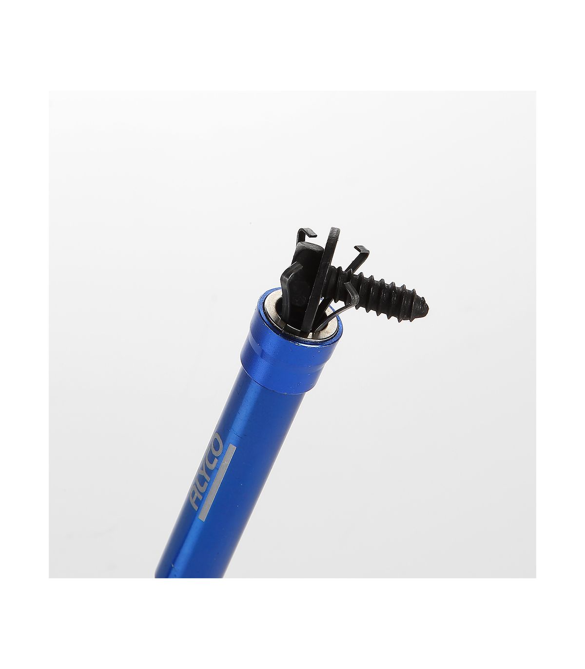 Cette pince est un outil très polyvalent pour accéder aux endroits difficiles. Elle est dotée d'un corps en aluminium léger et d'un corps en acier flexible. La pointe est magnétique et est équipée de quatre griffes qui sont actionnées par un bouton sur le manche. Une LED est également présente sur la pointe qui est activée par un bouton sur la poignée. Des piles 3xLR44 sont incluses.