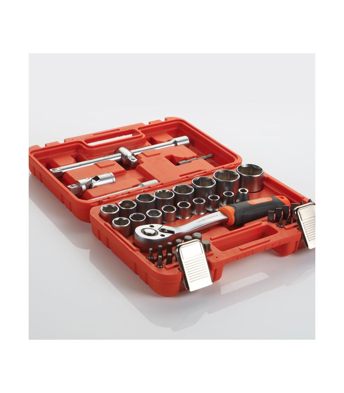 La supériorité technique de la référence 192388 repose sur la qualité de son acier Chrome Vanadium (CrV) forgé. Chaque douille hexagonale est traitée thermiquement pour garantir une résistance maximale à l'éclatement et une protection contre le matage des angles d'écrous. Le cliquet réversible 1/2" constitue le cœur de ce set : doté de 72 dents, il permet un travail d'une grande fluidité avec un angle de reprise de seulement 5 degrés, un atout majeur dans les compartiments moteurs denses. Le bouton de déverrouillage rapide assure une fixation sans faille des douilles tout en permettant un changement d'outil instantané, même avec des mains gantées.