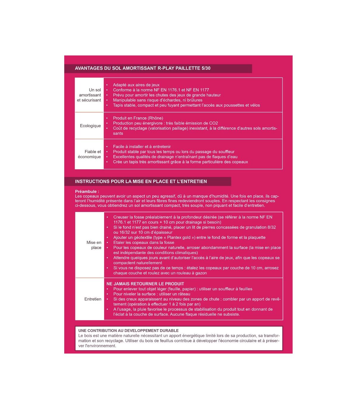 - Densité optimisée permettant de réaliser facilement une couche amortissante sécurisée sous les structures de jeux.