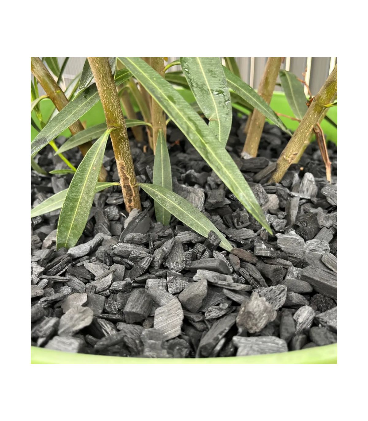 [Image showing the contrast between dark green plants and the deep black biochar mulch]