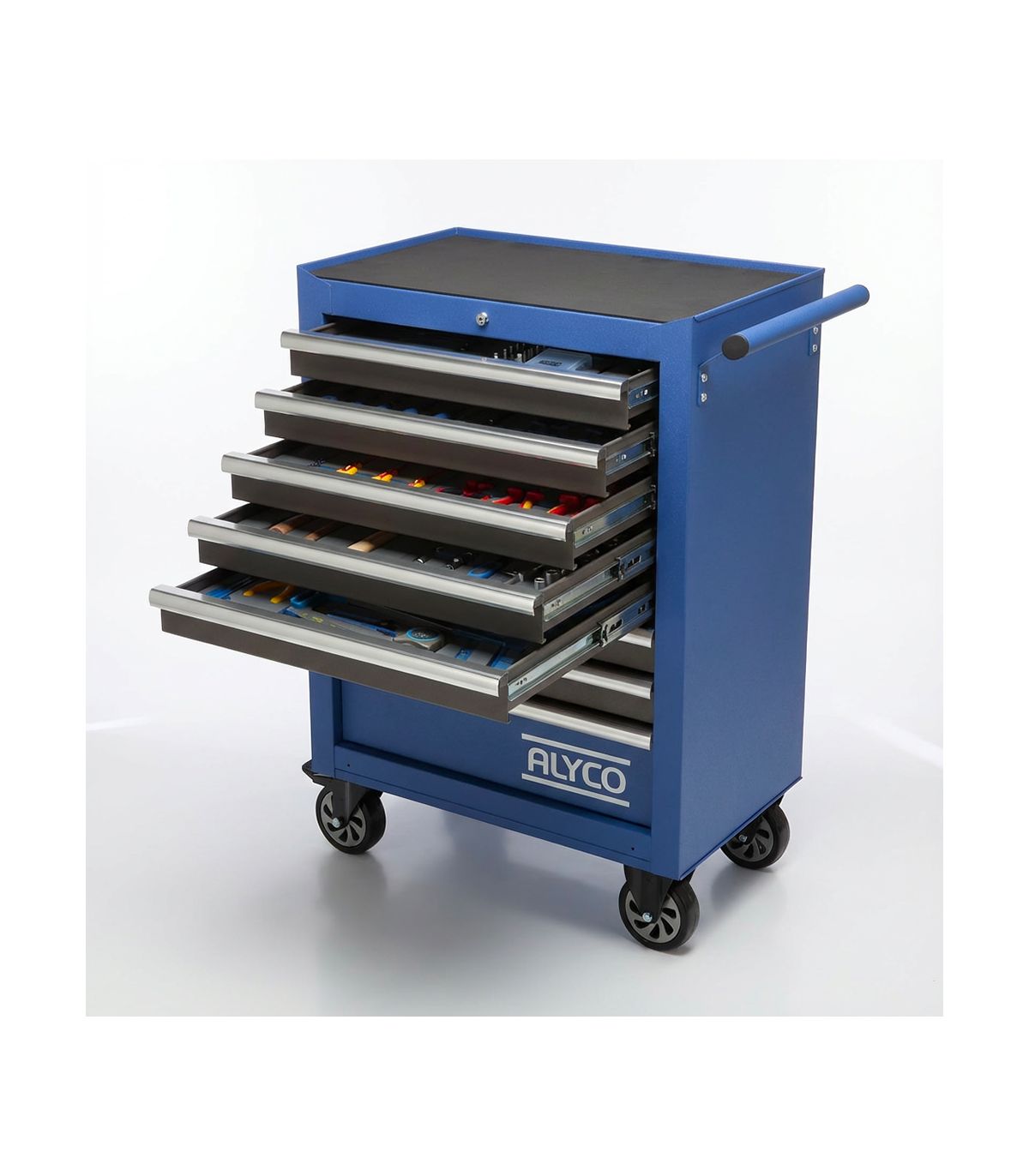 - Servante Garnie d'Outils : Solution 'prête-à-l'emploi' incluant un chariot métallique de 8 tiroirs et un assortiment complet d'outillages à main sélectionnés par Alyco.