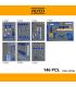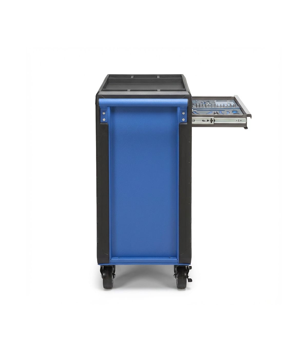 La supériorité technique de la référence 129724 repose sur sa structure robuste et son organisation interne optimisée. Fabriqué en tôle d'acier de forte épaisseur (0,8 mm), le châssis est conçu pour supporter des charges lourdes jusqu'à 300 kg sans aucune flexion. Les 7 tiroirs sont équipés de glissières à billes télescopiques de haute précision, permettant une ouverture totale pour un accès aisé aux outils logés au fond. L'innovation de ce modèle réside dans son plateau supérieur en plastique ABS moulé. Contrairement aux surfaces planes classiques, ce plateau intègre des compartiments spécifiques pour trier la visserie, les forets ou les petites pièces en cours de manipulation, évitant ainsi les pertes sur le sol de l'atelier. L'assortiment d'outils Alyco inclus (clés mixtes, cliquets, douilles 1/4" et 1/2", tournevis, pinces) est déjà disposé dans des modules thermoformés, assurant un rangement millimétrée et un contrôle visuel immédiat.