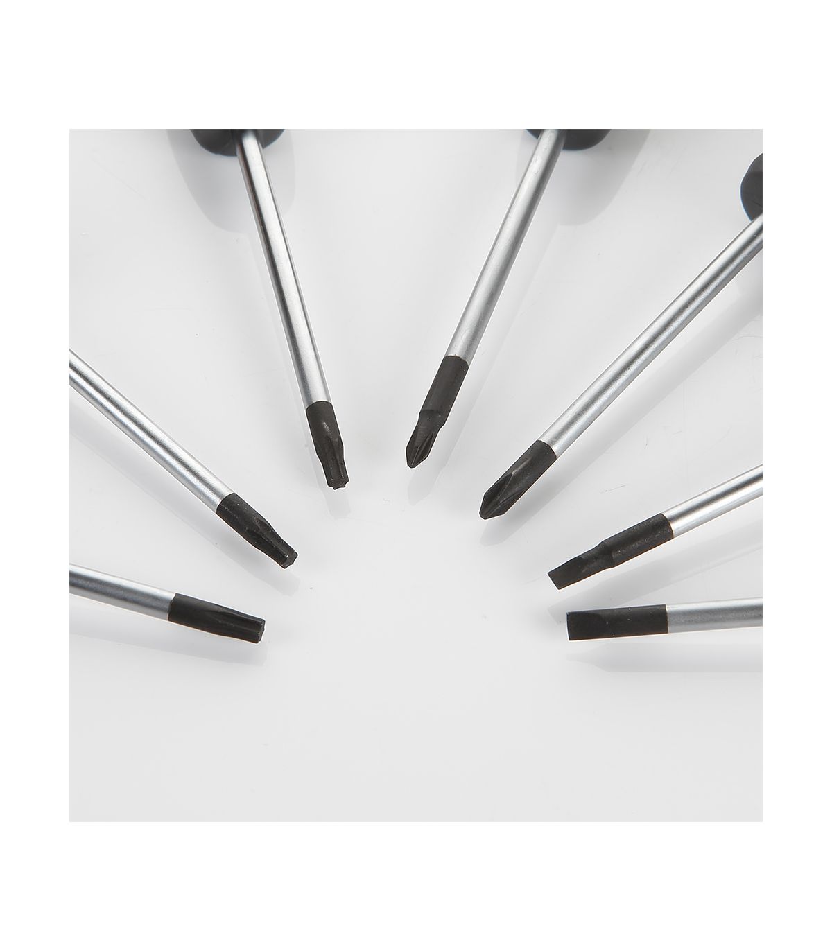 Le set se compose de 7 tournevis soigneusement sélectionnés pour couvrir les standards de l'industrie du micro-vissage. Il inclut les tailles les plus fréquentes en empreinte plate et Phillips (cruciforme). Le boîtier de rangement fourni n'est pas un simple emballage : c'est un véritable organiseur de poche. Robuste et transparent, il permet de vérifier instantanément que votre set est complet avant de quitter un chantier. Chaque outil a sa place attitrée, ce qui évite l'entrechoquement des pointes fines et préserve leur tranchant. En choisissant Alyco, vous optez pour une solution de précision qui valorise votre expertise et sécurise vos interventions les plus délicates.