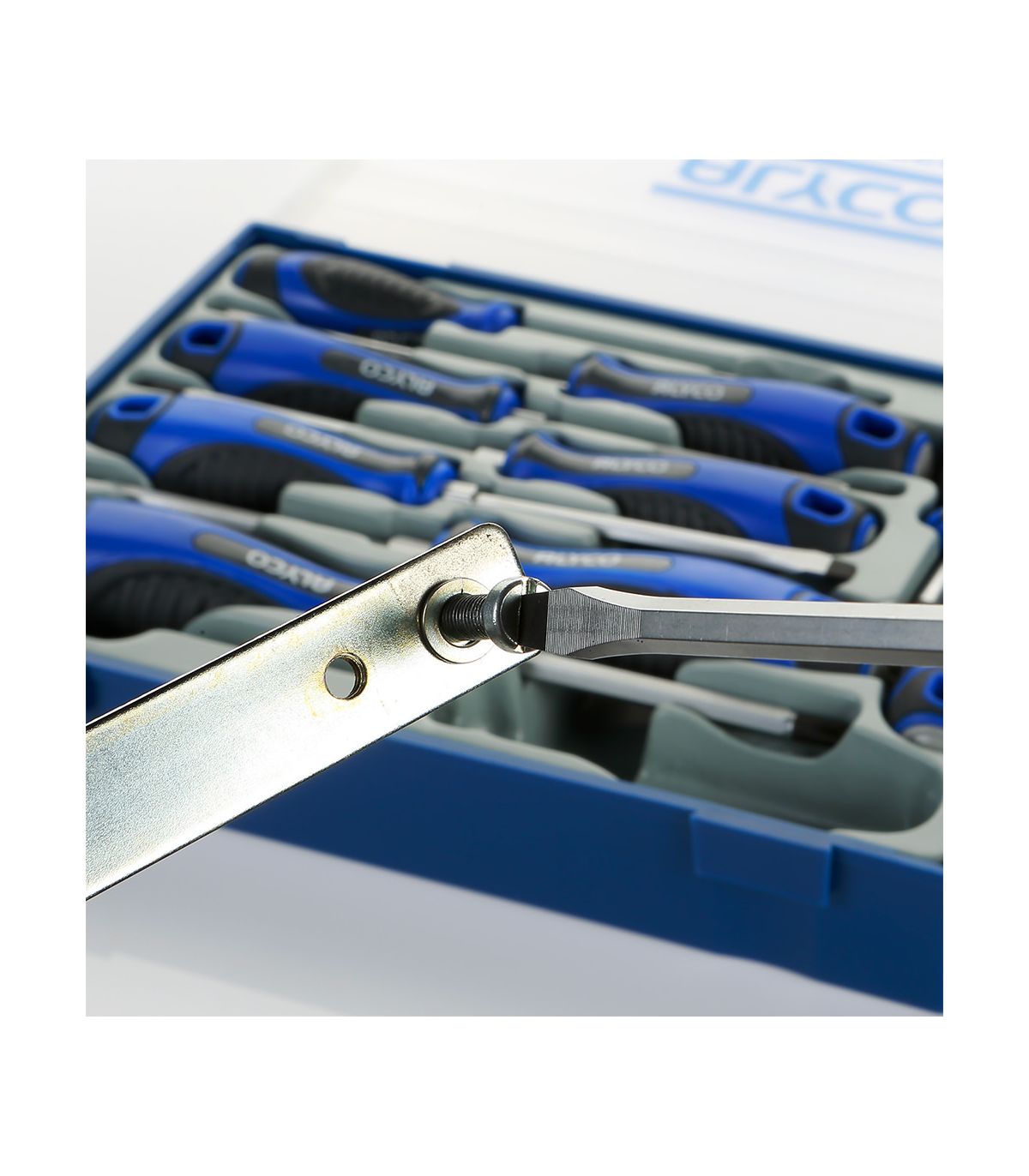 Côté performance, Alyco ne fait aucun compromis. Tous les tournevis de ce module sont fabriqués en acier spécial S2 (acier à outils/ressorts), offrant un coefficient d'absorption de l'effort bien supérieur aux modèles classiques. Pour les vissages récalcitrants, les tiges de forte section sont hexagonales et équipées d'un hexagone conducteur (bolster) à la base du manche. Cette caractéristique permet d'utiliser une clé plate pour démultiplier le couple de serrage sans effort excessif. Les pointes, magnétisées et traitées par induction, assurent un contact parfait avec l'empreinte de la vis, garantissant une précision totale et une protection contre l'usure prématurée.