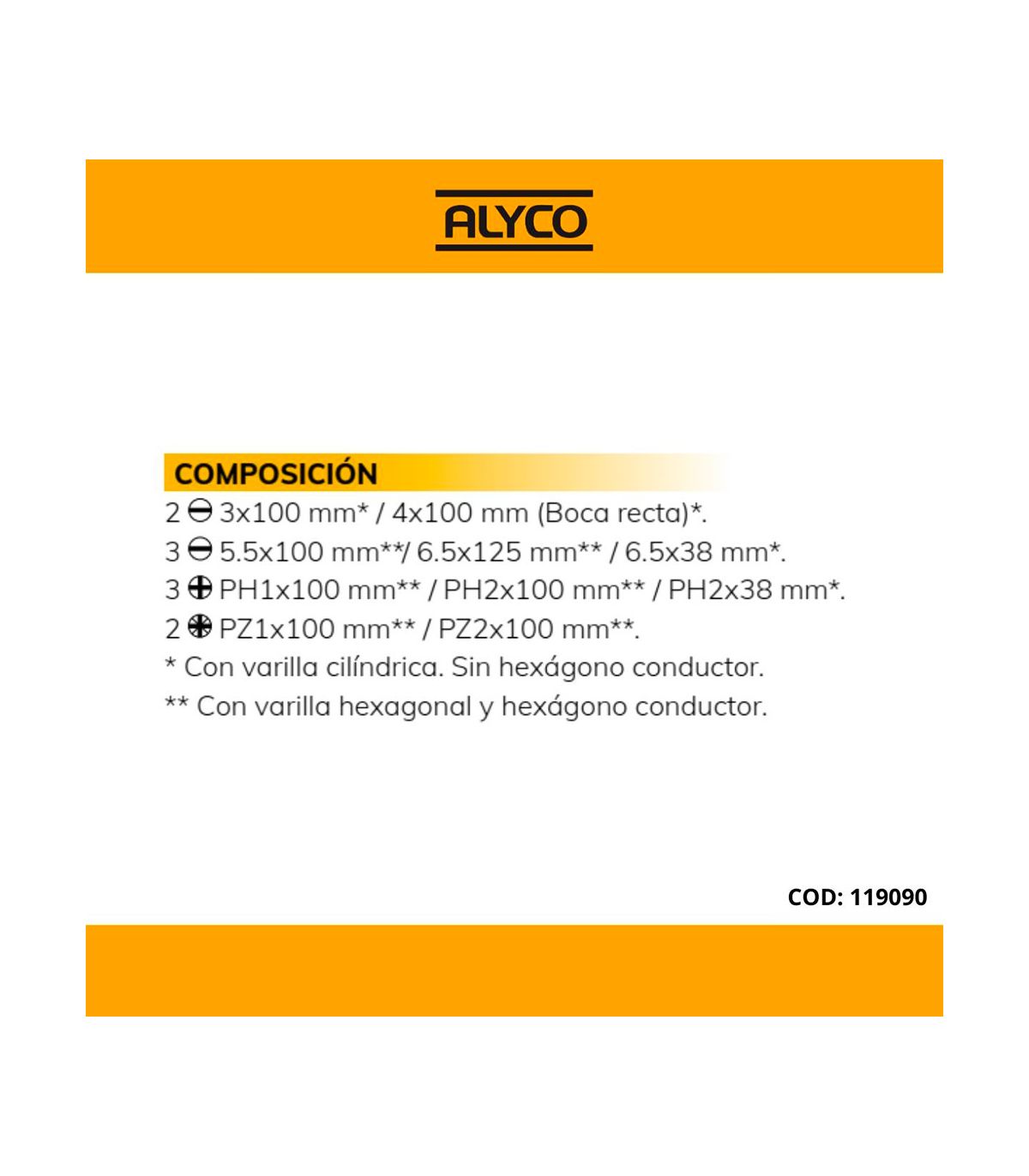 - Pozidriv : PZ1x100 mm** / PZ2x100 mm**.