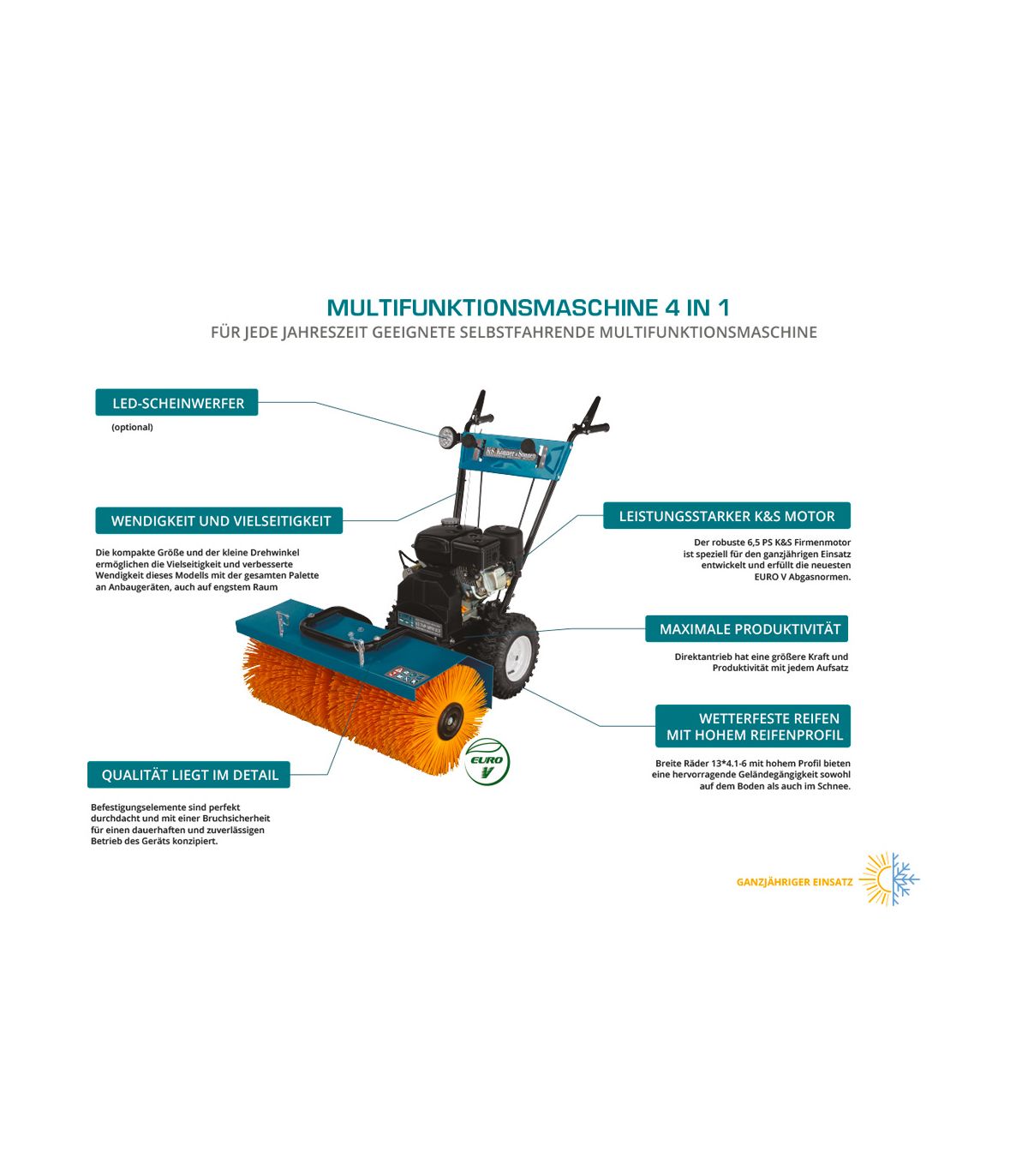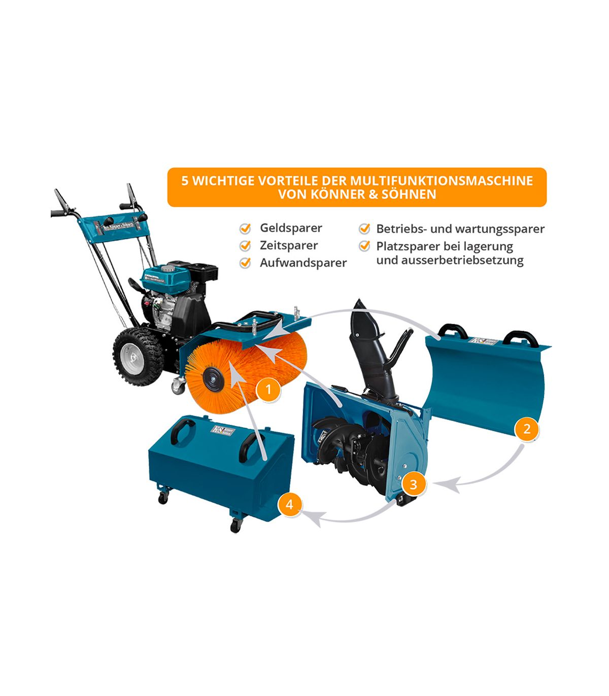 La machine multifonctionnelle KS 7HP-MFM 60 de Könner & Söhnen est l'outil indispensable pour l'entretien extérieur des propriétés privées, des hôtels, des petites copropriétés ou des collectivités. Conçue comme une véritable "bête de somme" toutes saisons, elle remplace avantageusement plusieurs machines encombrantes par un seul moteur performant et des accessoires interchangeables. Que ce soit pour balayer les feuilles mortes en automne, nettoyer la poussière au printemps ou dégager la neige fine en hiver, elle répond présente 365 jours par an.