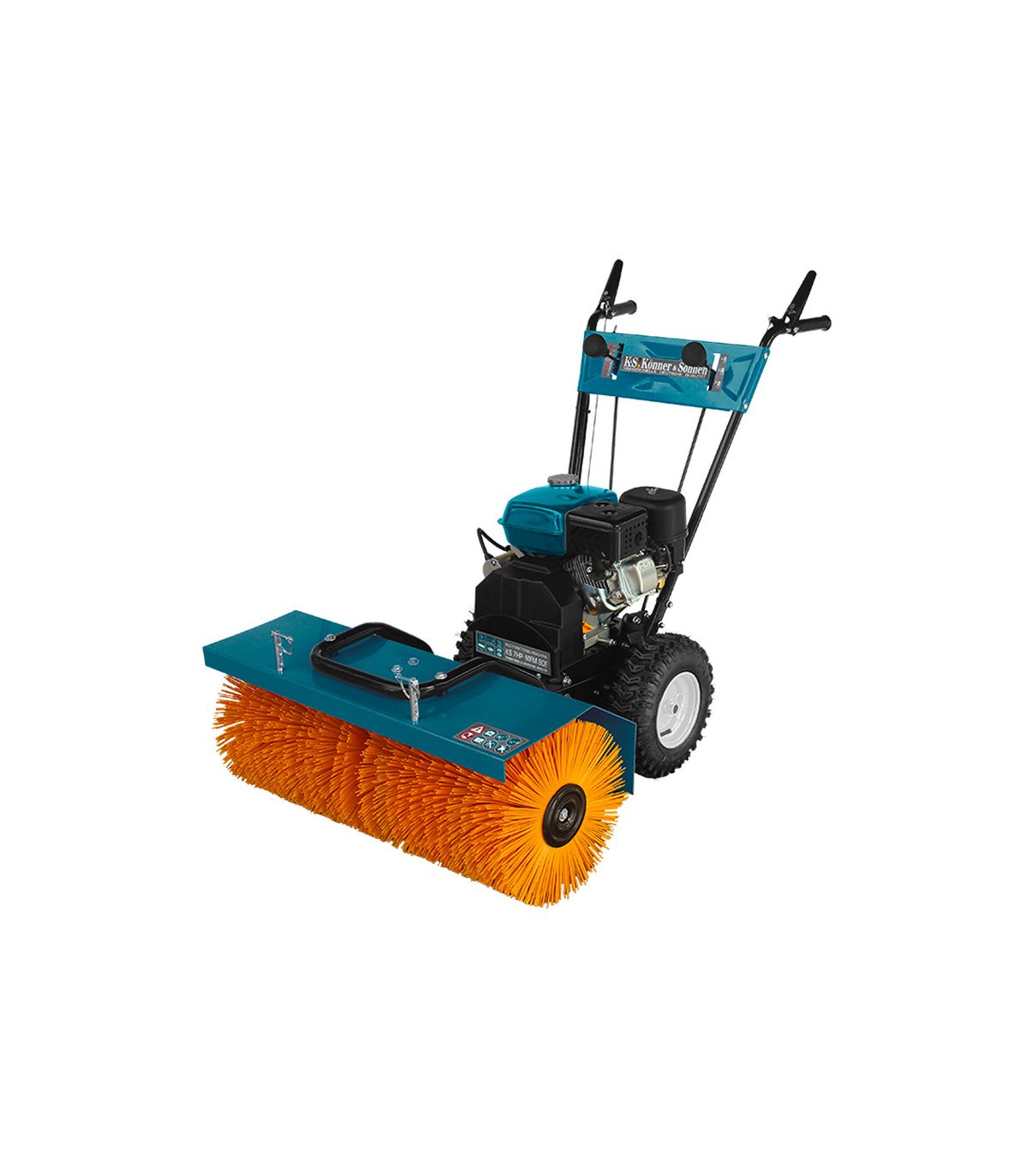 La machine est bâtie sur un châssis en acier renforcé, conçu pour subir les vibrations et les chocs liés au travail extérieur. Ses roues à profil agraire (13 * 4.1-6) assurent une motricité parfaite sur les sols meubles ou glissants. Le guidon ergonomique centralise toutes les commandes : levier d'engagement de la brosse, changement de vitesses et accélérateur. La position de conduite est naturelle, limitant la fatigue dorsale même lors d'utilisations prolongées.