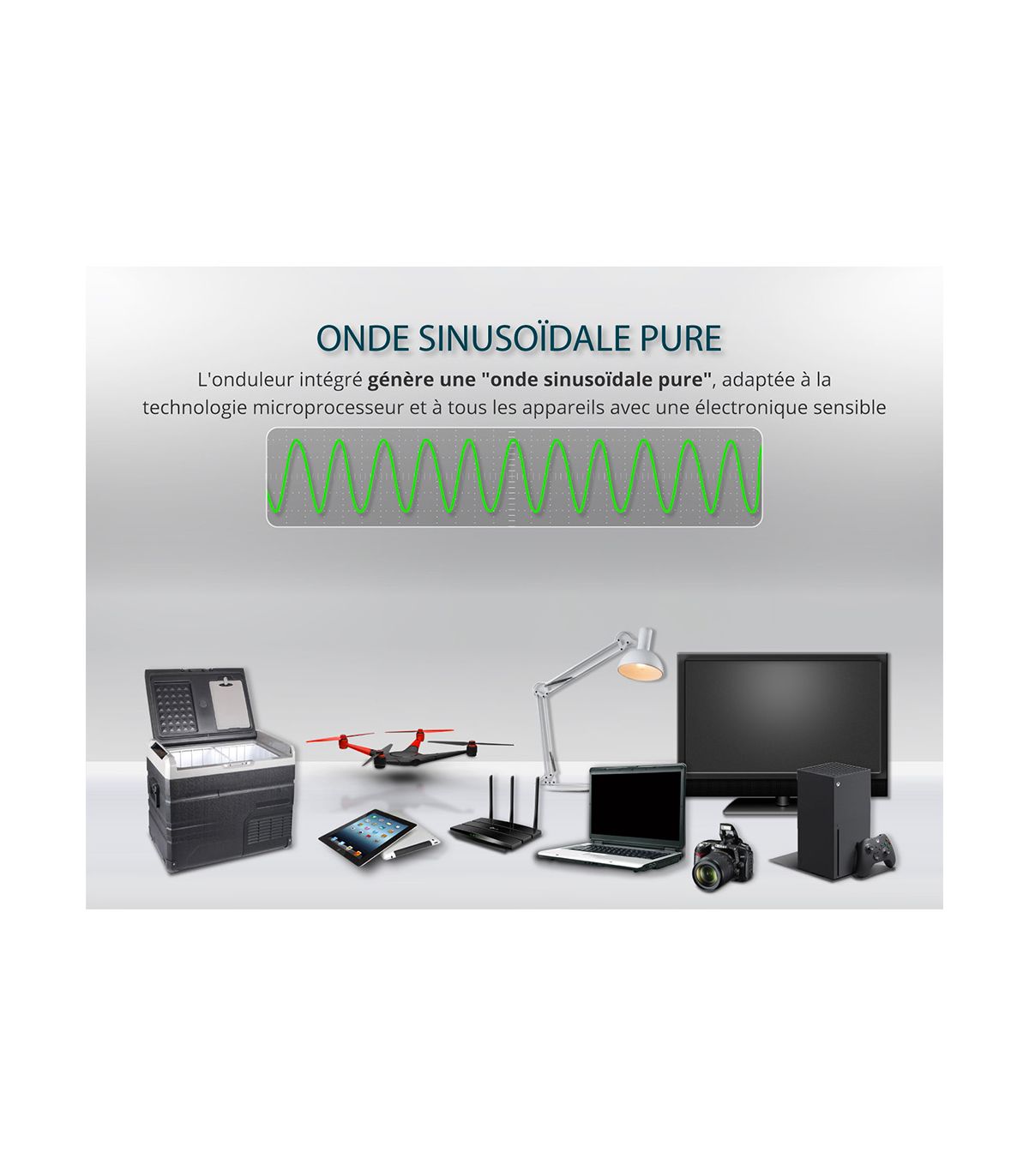 - 1 prise AC 230V : Pour brancher vos appareils domestiques standard comme une lampe ou un chargeur de PC.