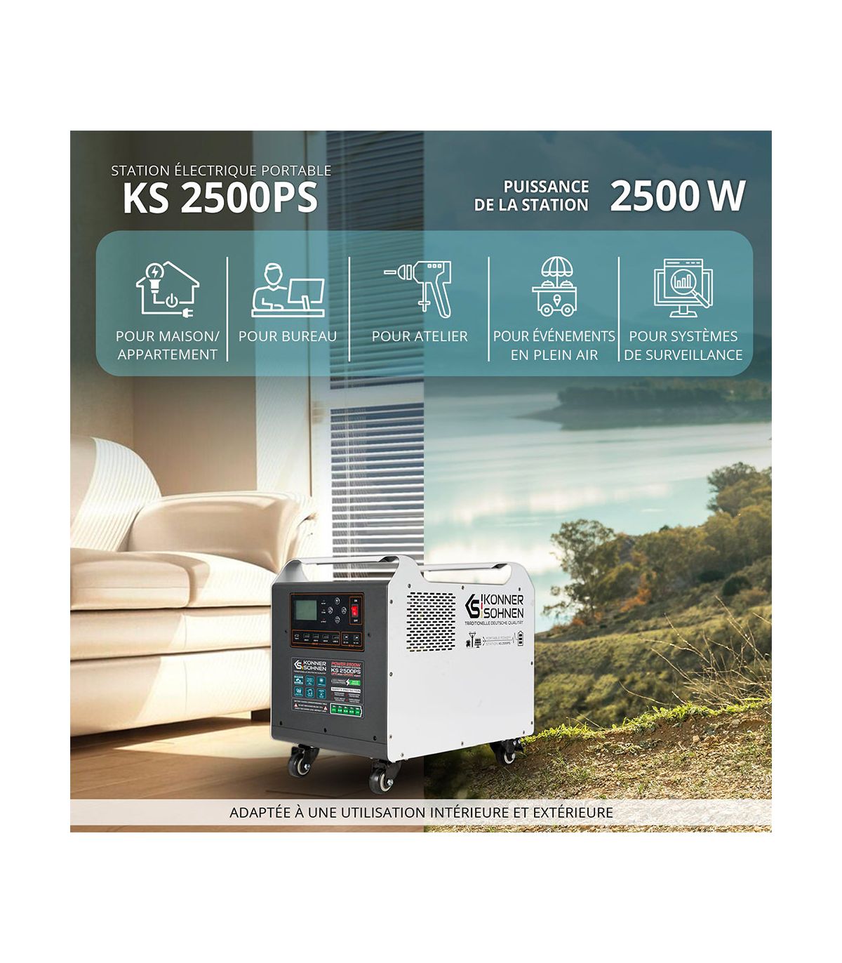 Cette mobilité fait de la KS 2500PS l'outil idéal pour les applications nomades (festivals, marchés, camping-car) ou pour être déplacée facilement entre le garage (stockage) et le jardin (recharge solaire).