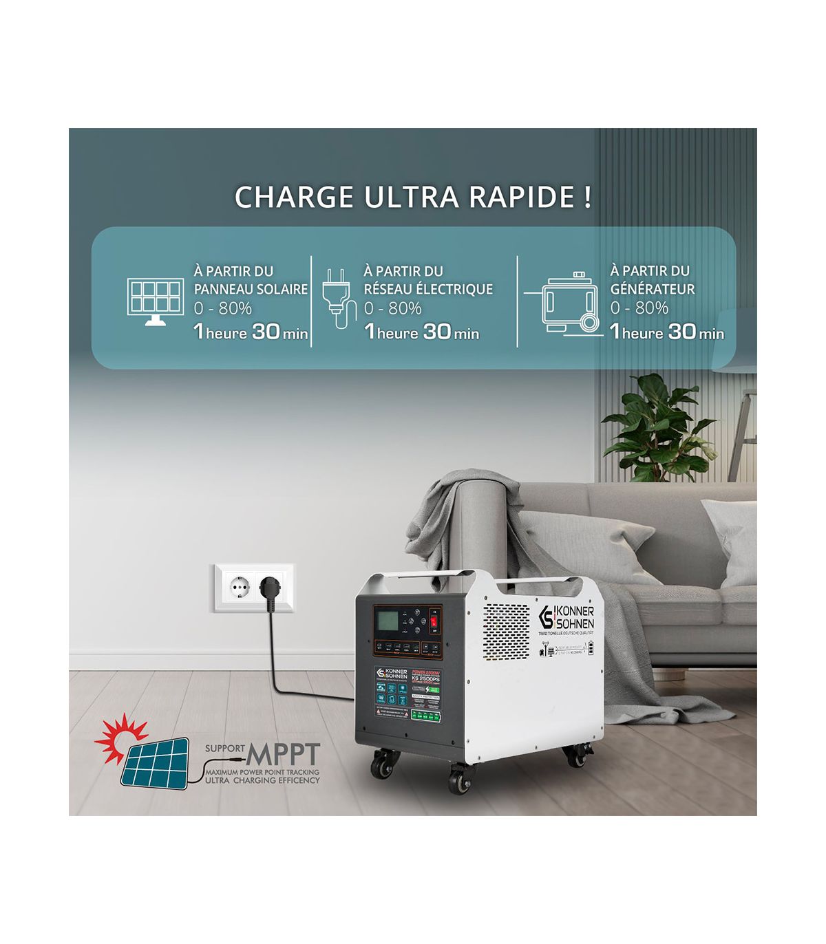 La KS 2500PS délivre une puissance nominale continue de 2500 Watts. Cette réserve de puissance lui permet de s'affranchir des limitations habituelles des générateurs solaires. Elle n'est pas là pour charger des téléphones, mais pour faire tourner une maison ou un atelier :