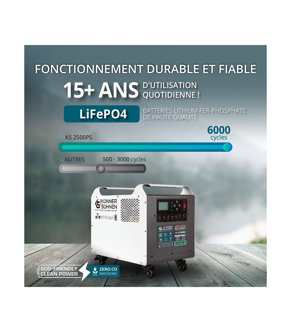 Le point fort incontestable et différenciant de la KS 2500PS réside dans la qualité exceptionnelle de ses cellules de batterie. Alors que le marché standard des batteries LiFePO4 (Lithium Fer Phosphate) promet généralement 3000 à 4000 cycles, ce modèle intègre des composants de qualité "Automotive Grade" capables d'atteindre le chiffre record de 6000 cycles de charge et de décharge (en conservant 80% de la capacité initiale).