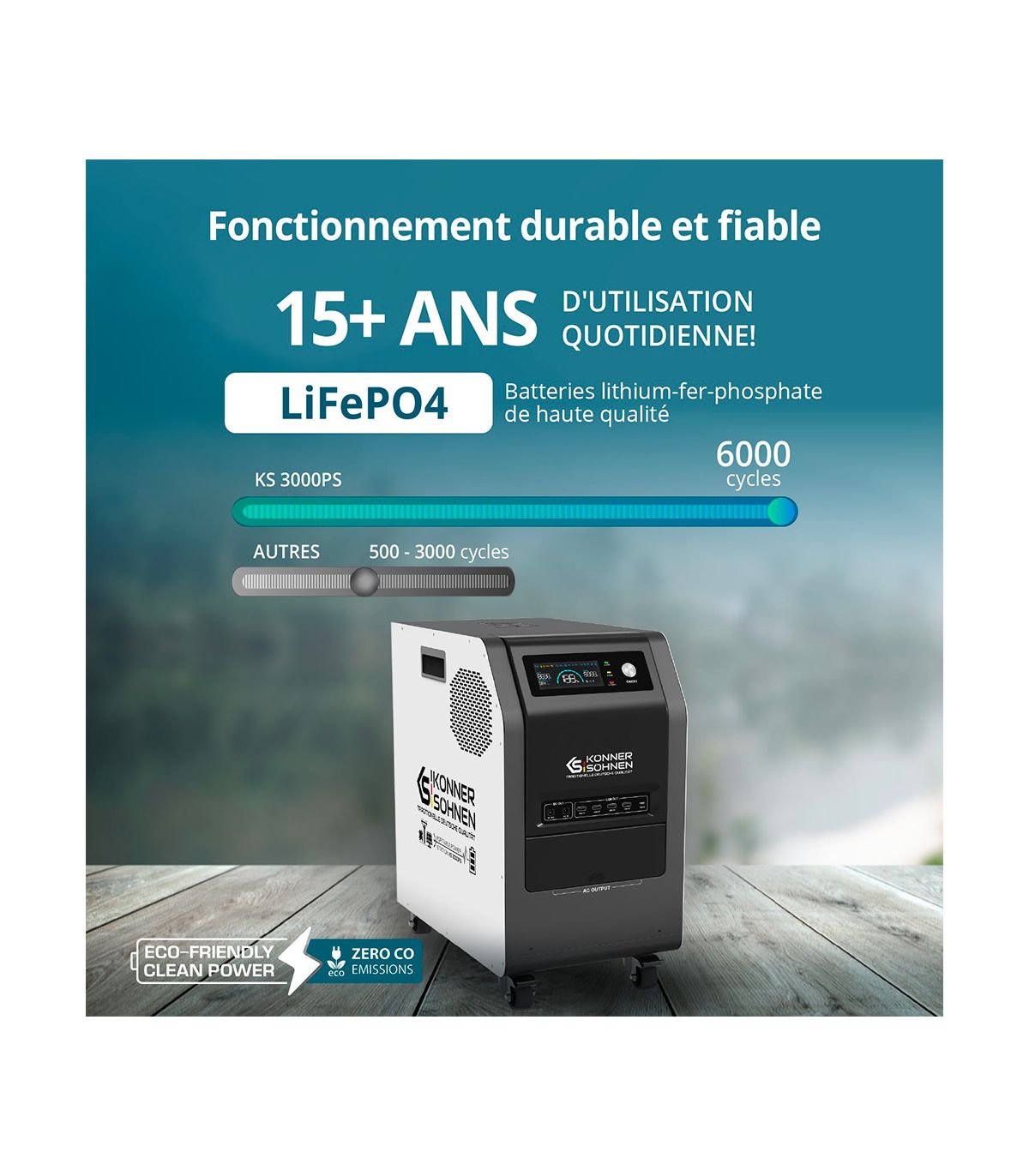 La batterie intégrée offre une capacité de stockage de 3200 Wh (3.2 kWh). C'est une réserve considérable qui permet, par exemple, de tenir une maison économe en énergie pendant 24 heures sans aucun apport solaire, ou de travailler plusieurs jours sur un site isolé avec de l'outillage. Contrairement aux petites stations de camping, la KS 3000PS est taillée pour le "Backup" résidentiel sérieux ou l'alimentation de sites "Off-Grid" (chalets, tiny houses, sites de télécommunication).