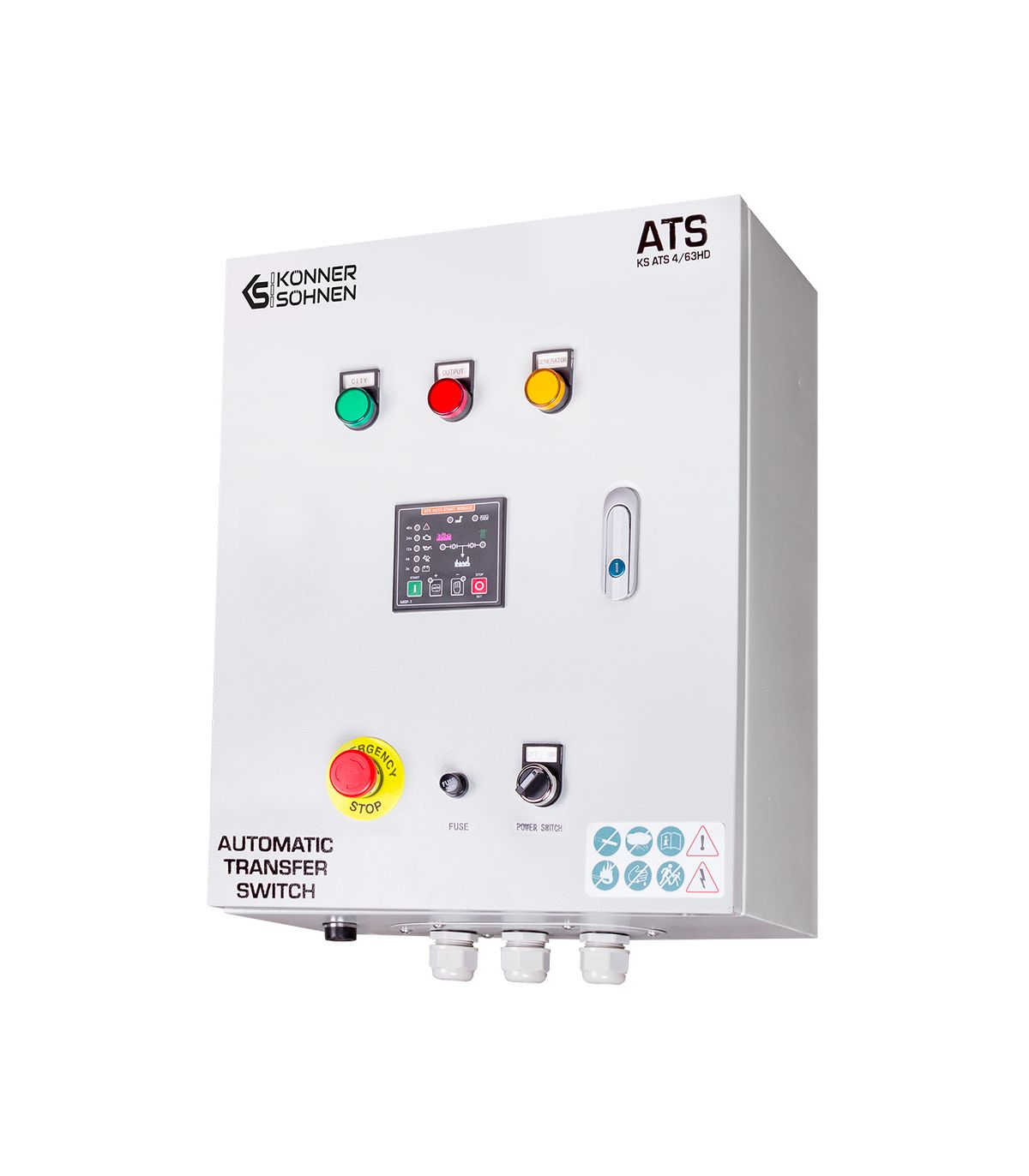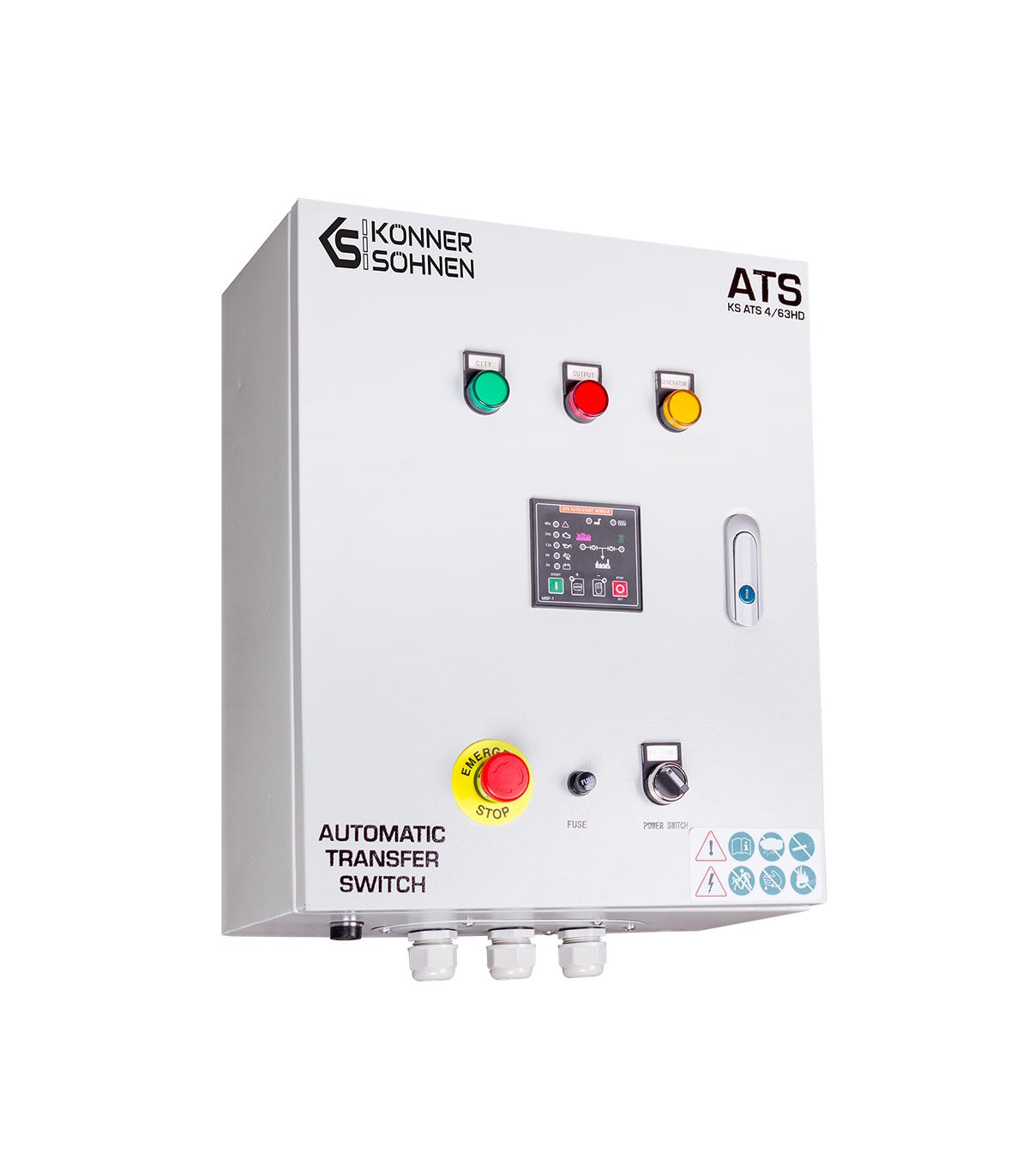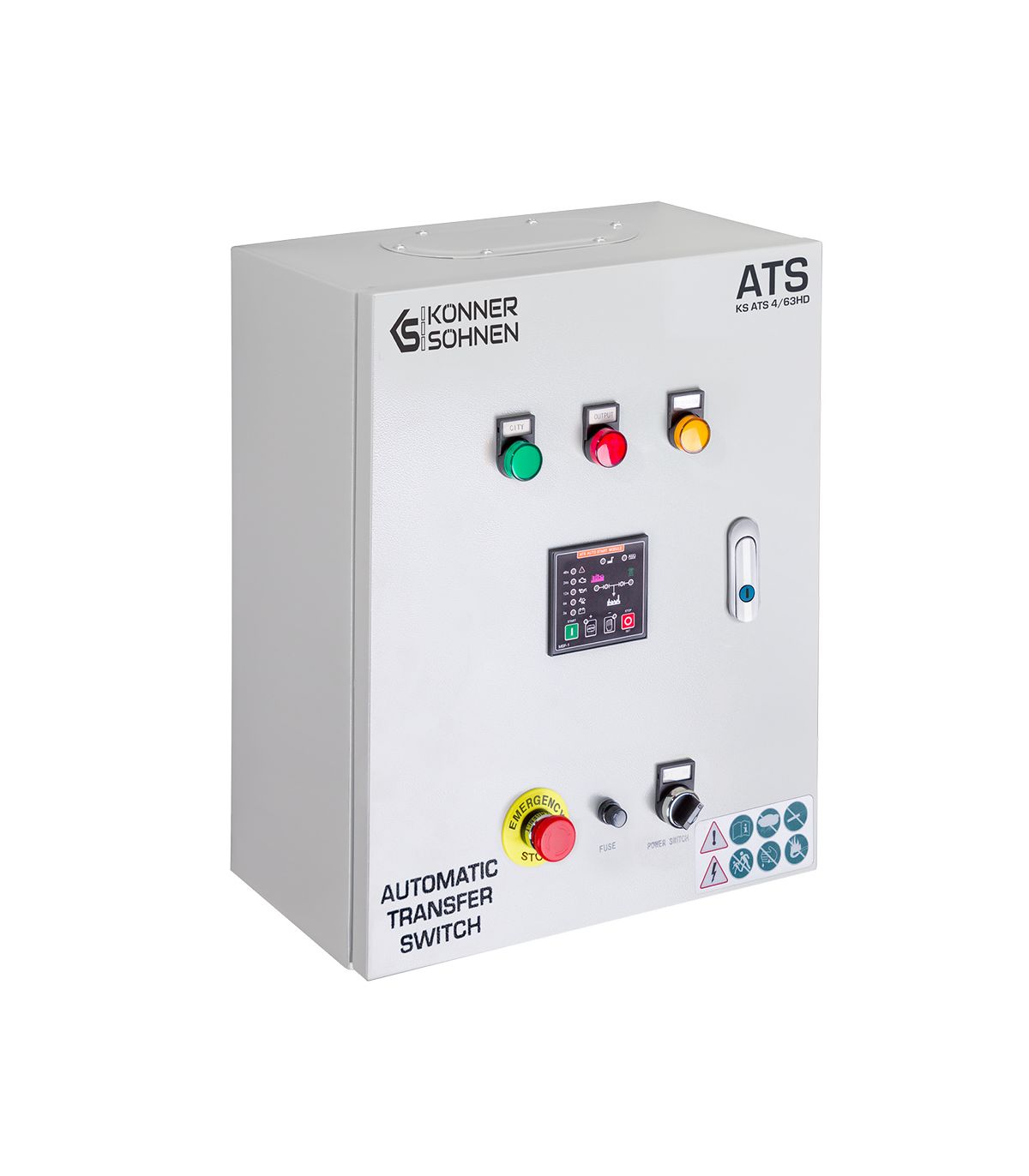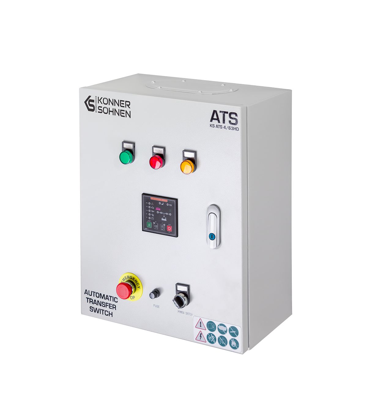 Le boîtier de transfert automatique KS ATS 4/63HD de Könner & Söhnen est le cerveau de votre système de sécurité énergétique. Dans un monde où la continuité électrique est devenue vitale pour le confort domestique comme pour la viabilité économique des entreprises, ce dispositif offre une tranquillité d'esprit absolue. Il transforme un simple groupe électrogène Diesel de la gamme "Heavy Duty" en une centrale de secours autonome, capable de réagir à la moindre défaillance du réseau public, de jour comme de nuit, que vous soyez présent ou non.