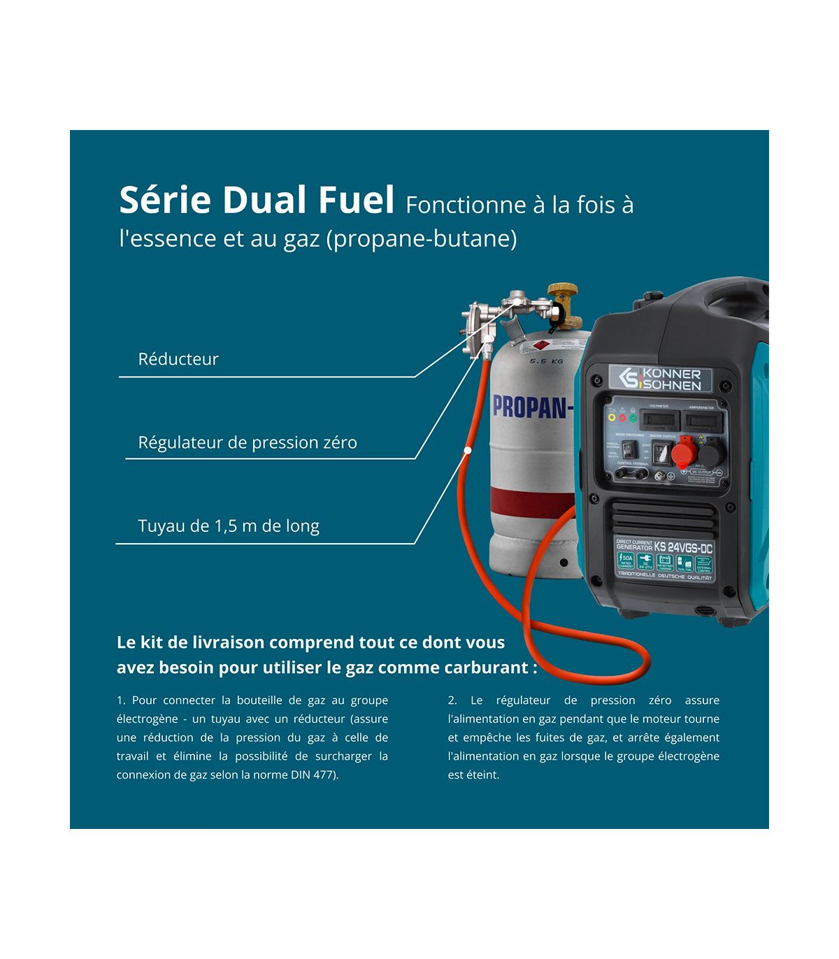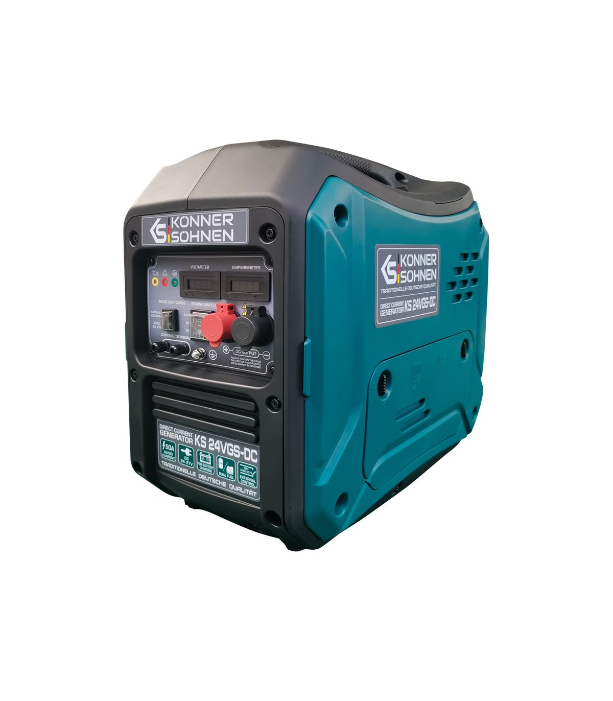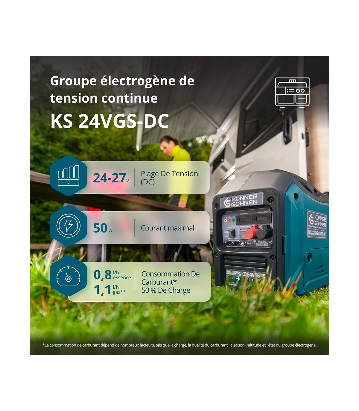 Le générateur KS 24VGS-DC représente le summum de l'autonomie intelligente chez Könner & Söhnen. Ce modèle combine trois technologies de pointe : la production directe de courant continu (DC), l'insonorisation et la motorisation **Bi-Fuel (Gaz/Essence)**. Conçu pour recharger des parcs de batteries 24V, il offre à l'utilisateur la possibilité de fonctionner au Gaz Propane (LPG), ce qui change la donne pour les sites isolés et les habitats mobiles.
