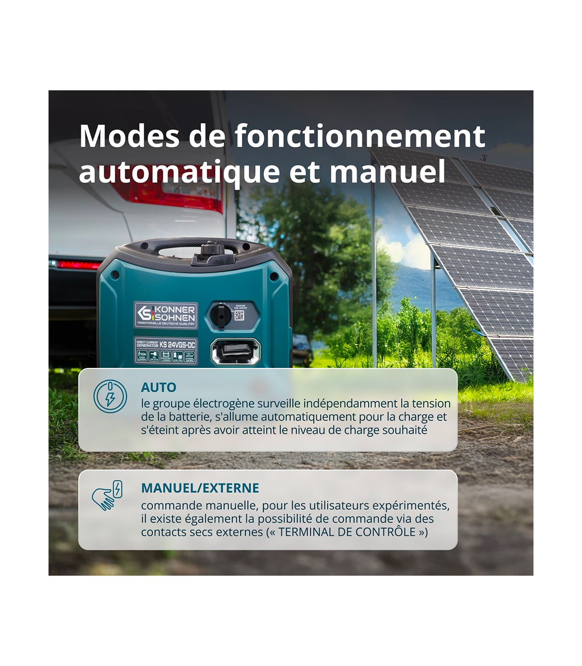 Connecté à un système photovoltaïque 24V, le KS 24VGS-DC agit comme le gardien de vos batteries. En mode Auto, il détecte la baisse de tension la nuit ou en hiver, démarre (au gaz ou essence), recharge les batteries à 60 Ampères, puis s'éteint. Vous n'avez rien à gérer. C'est la solution préférée pour les chalets d'alpage ou les stations météo autonomes.