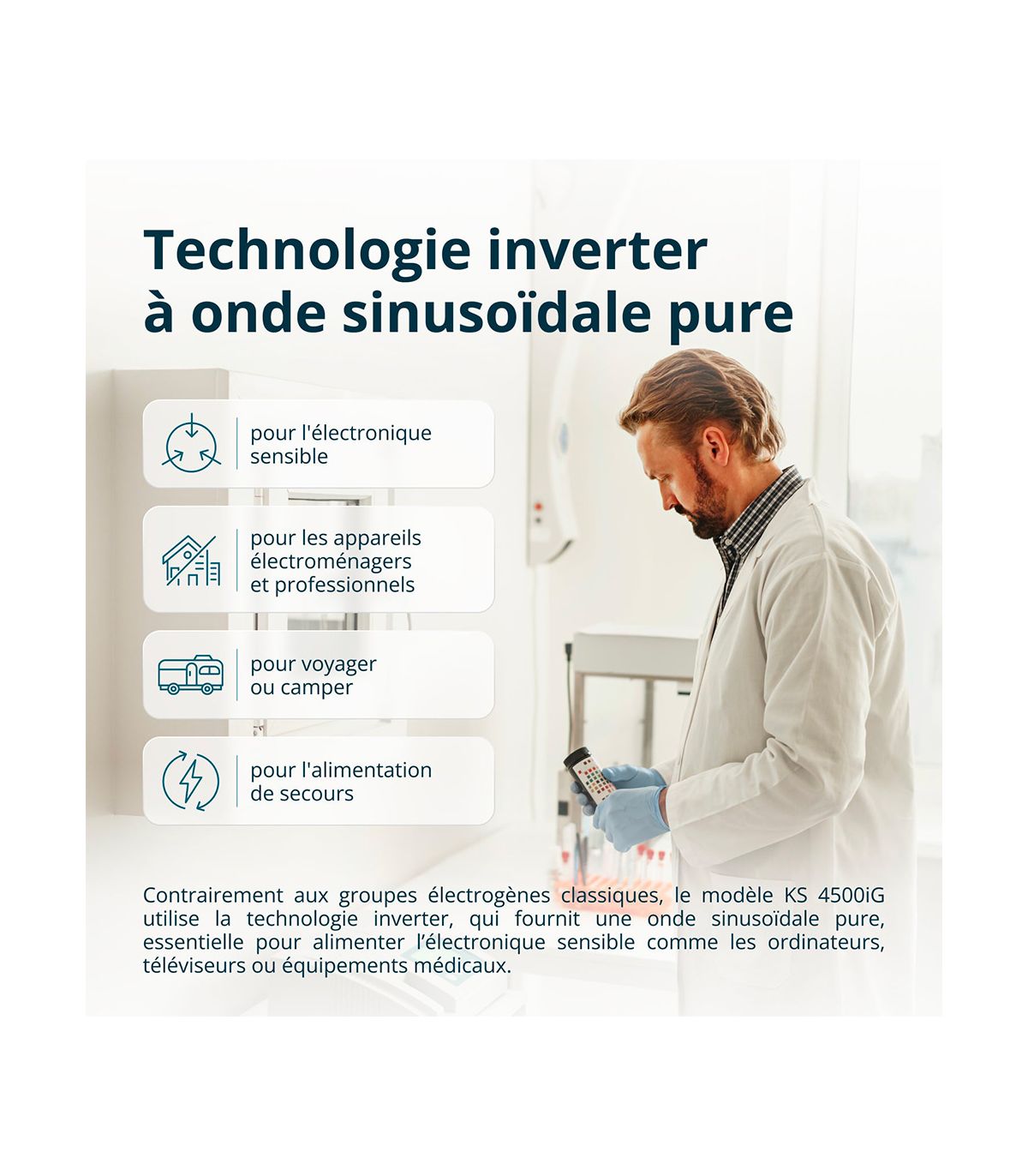 Le KS 4500iG ne fait aucun compromis sur la qualité électrique. Son module Inverter piloté par microprocesseur délivre une tension de 230V à 50Hz avec une distorsion harmonique quasi nulle (Onde Sinusoïdale Pure). Vous pouvez y brancher en toute confiance votre téléviseur 4K, votre routeur internet, votre ordinateur de télétravail ou la carte électronique de votre chaudière gaz. Le basculement entre les modes Essence et Gaz se fait simplement, garantissant que vous aurez toujours une solution énergétique sous la main.