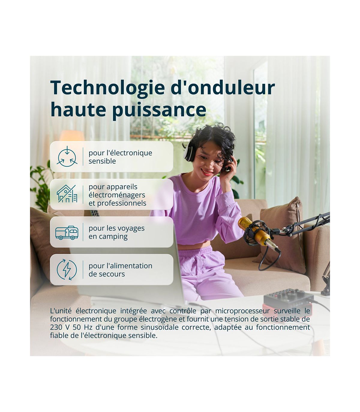 Pour ne plus avoir à choisir entre puissance et qualité de courant. Il offre les deux. C'est l'outil idéal pour sécuriser une habitation moderne remplie d'électronique ou pour travailler de manière autonome avec des outils professionnels gourmands en énergie.