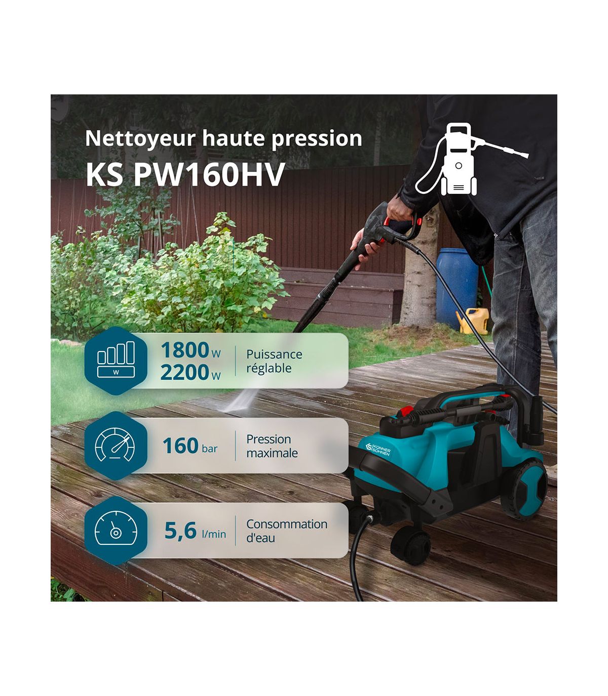 La grande innovation du modèle KS PW160HV est son régulateur de puissance de lavage. Avoir 160 bars de pression est un atout, mais pouvoir baisser cette pression est indispensable pour ne pas endommager les surfaces fragiles. Grâce à ce bouton de contrôle, vous passez d'un mode "Décapage Brut" (pour le béton) à un mode "Nettoyage Délicat" (pour les boiseries de jardin ou la carrosserie d'une voiture ancienne) en un tour de main. Cette flexibilité vous permet de tout nettoyer avec un seul appareil, en optimisant la consommation d'eau et d'énergie.