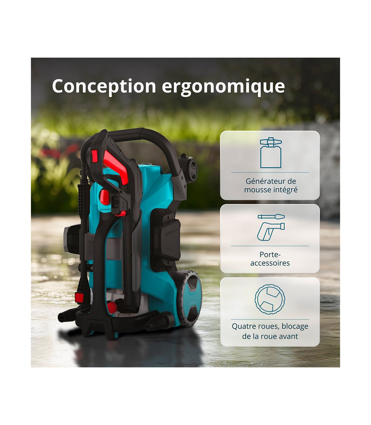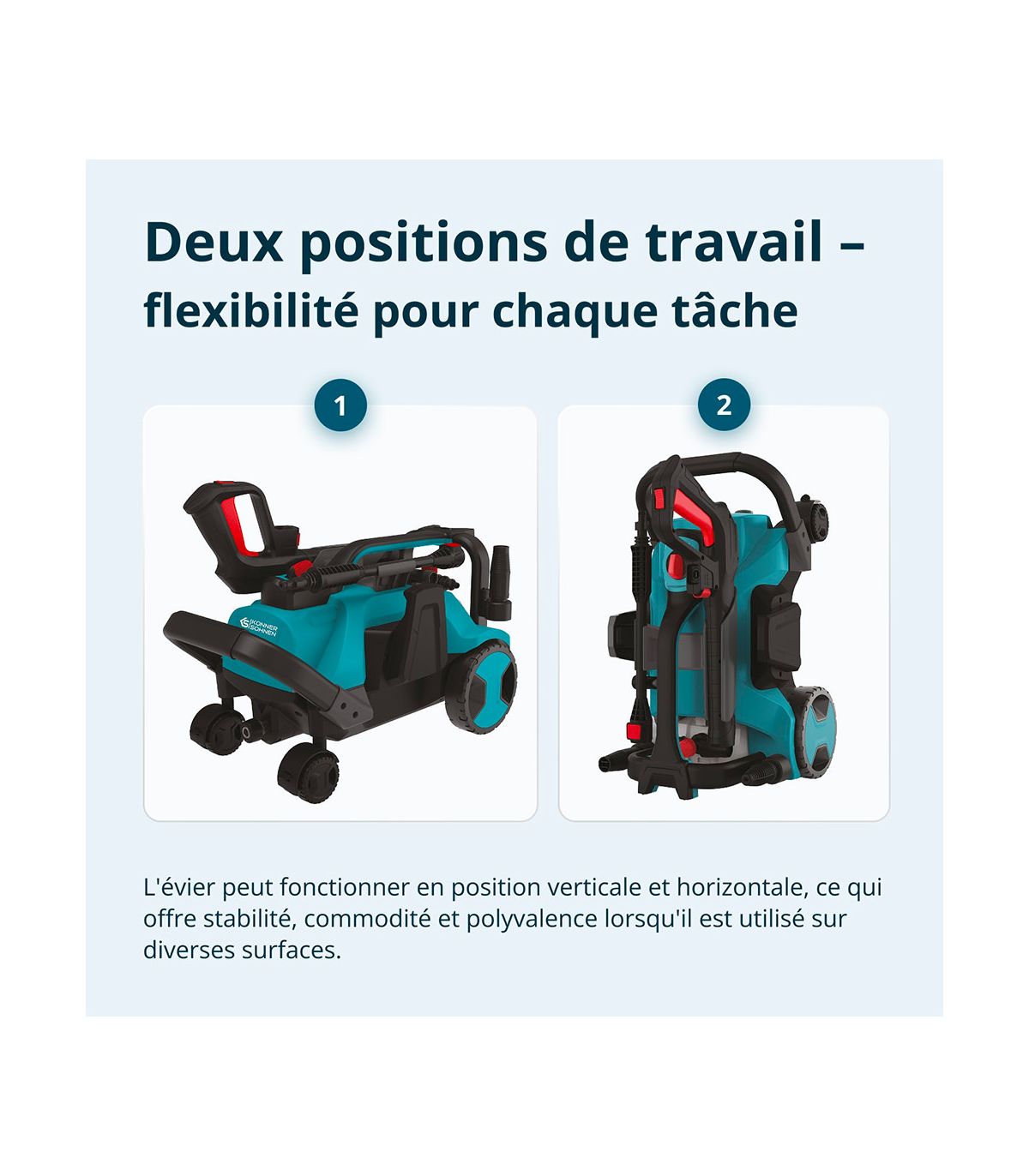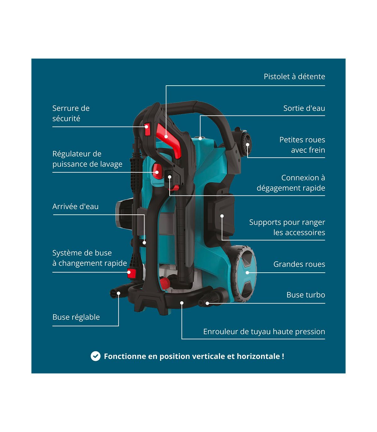 - Rangement intégré : Des supports dédiés sur le châssis permettent de ranger la lance, le pistolet et le câble électrique, assurant que tout reste organisé et à portée de main.