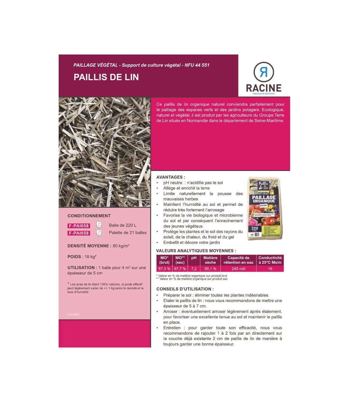 - Paillis de lin organique RACINE, paillage végétal haut de gamme conforme NFU 44-551 pour massifs et potagers.