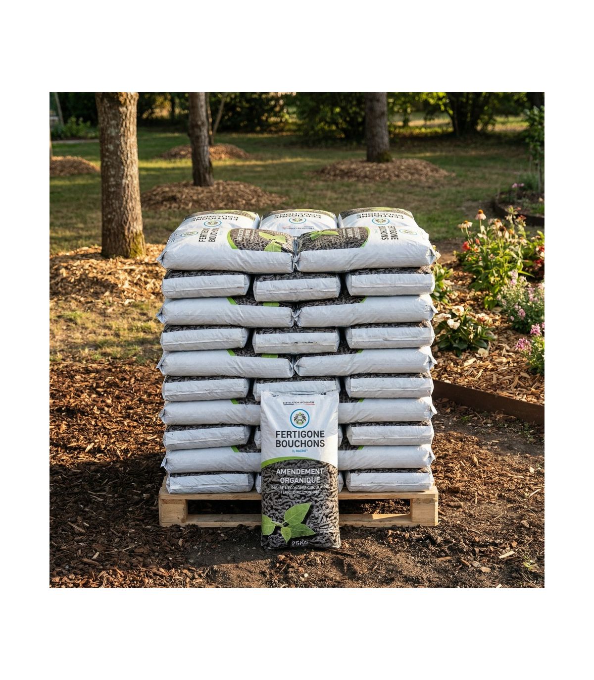 - Arbre / Arbuste : 3 à 5 kg par pied. Fleurs, massifs, jardinières : 20 % du volume terre ou terreau