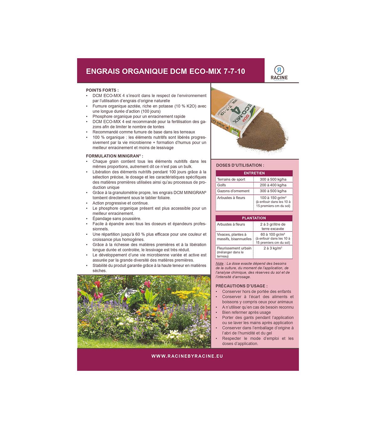- La dose exacte dépend des besoins de la culture, du moment de l’application, de l’analyse chimique, des réserves du sol et de l’intensité d‘arrosage.