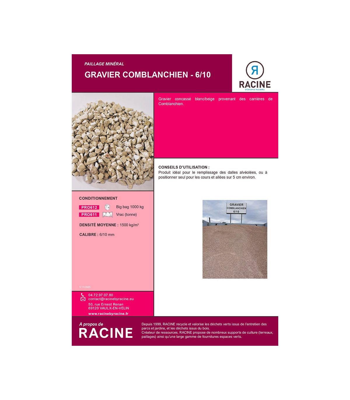 | Conseil d'usage | Produit idéal pour le remplissage des dalles alvéolées, ou à positionner seul pour les cours et allées sur 5 cm environ. |