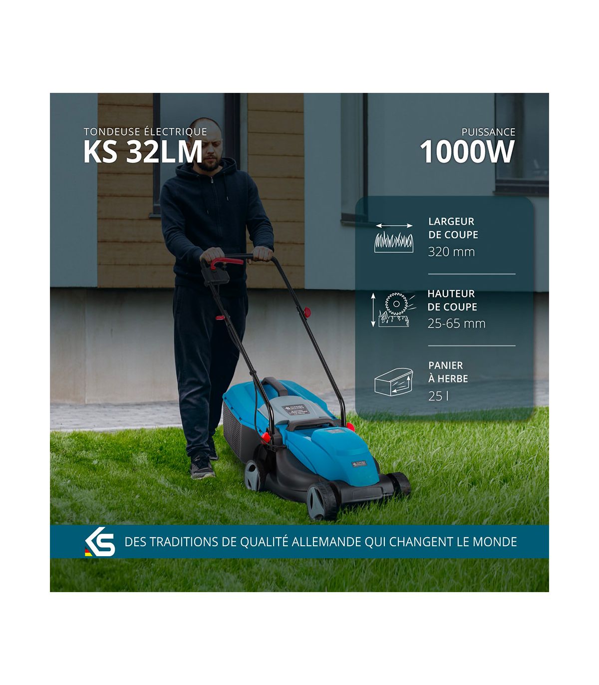 - Moteur Électrique 1000W : Puissance instantanée et silencieuse pour tondre jusqu'à 300m² sans fatigue.