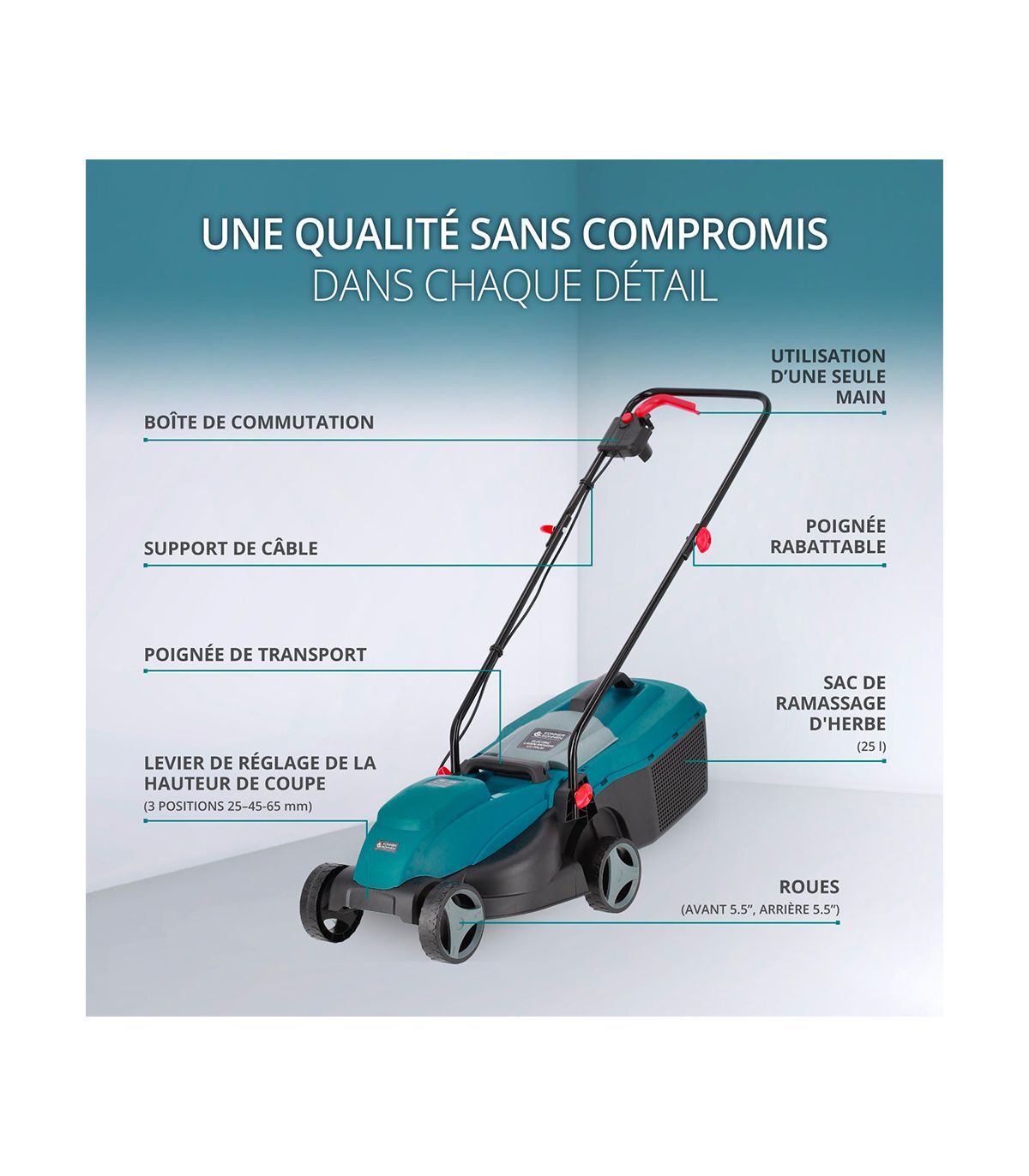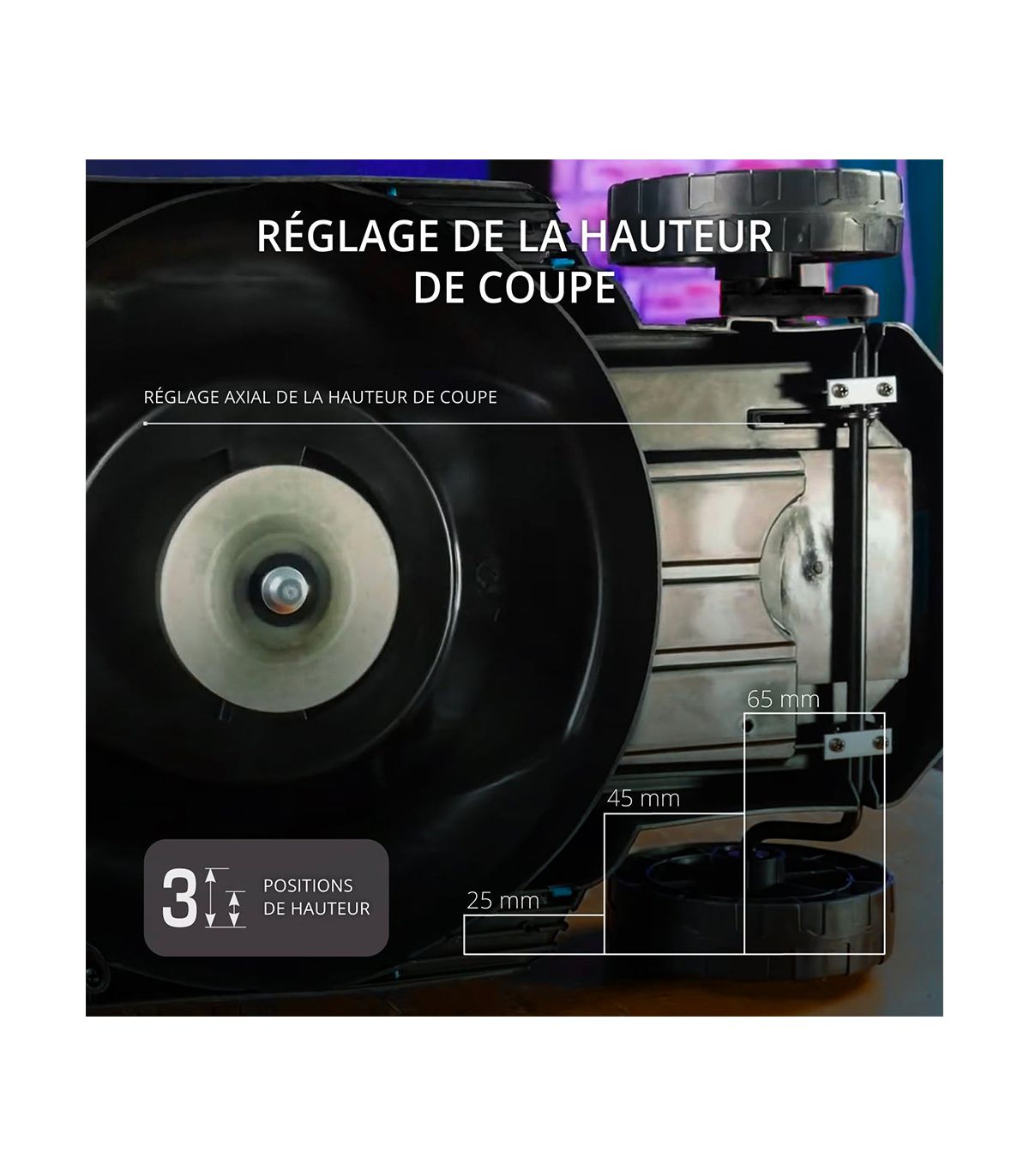 - Réglage Centralisé 3 Hauteurs : Ajustez la coupe (25/45/65 mm) d'un seul levier, sans outils.