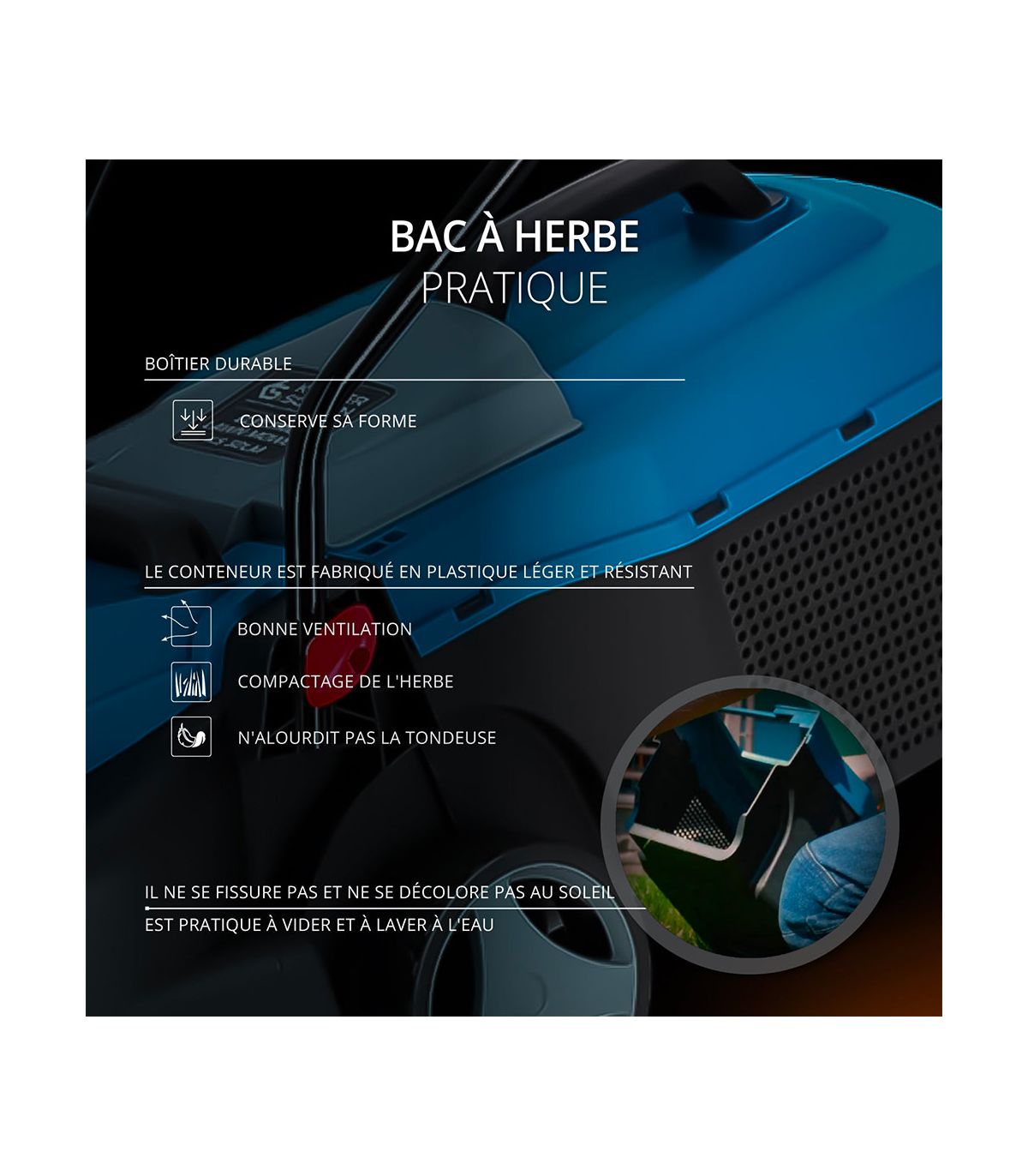 La KS 32LM est équipée d'un bac de ramassage de 25 litres. Sa conception combine plastique rigide et toile (selon versions) ou tout plastique pour une durabilité maximale. Il est léger, facile à décrocher et à vider. Sa capacité est parfaitement dimensionnée pour la surface cible : vous tondez votre petit jardin sans avoir à le vider dix fois.