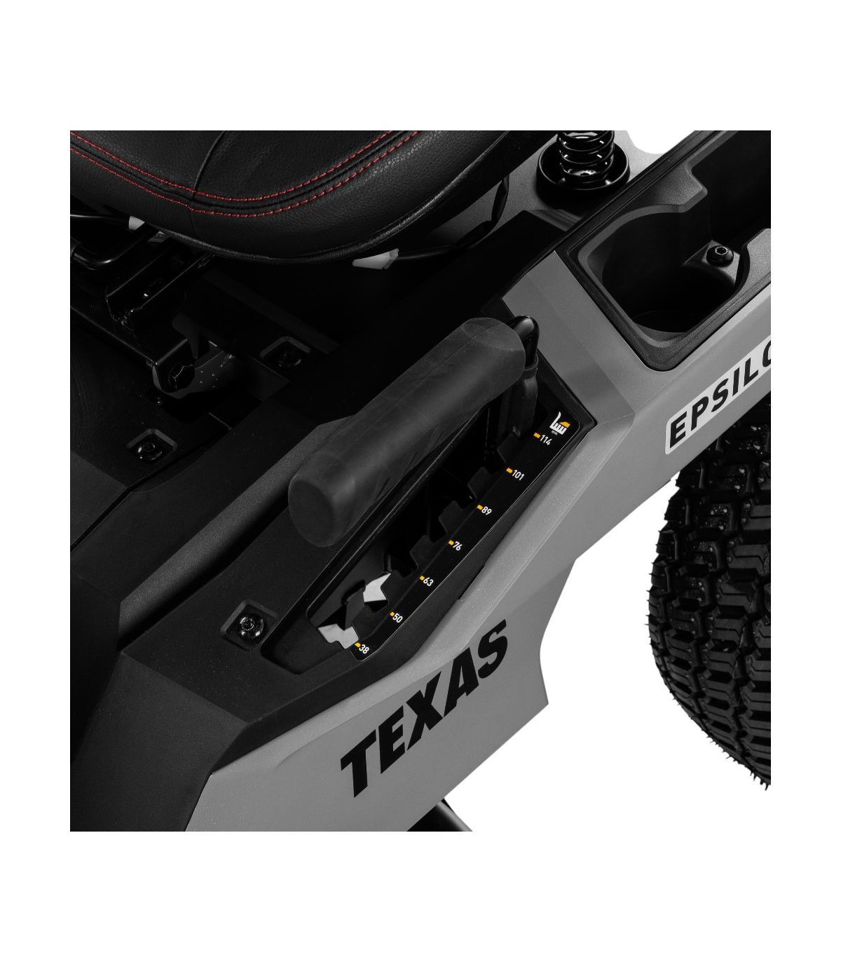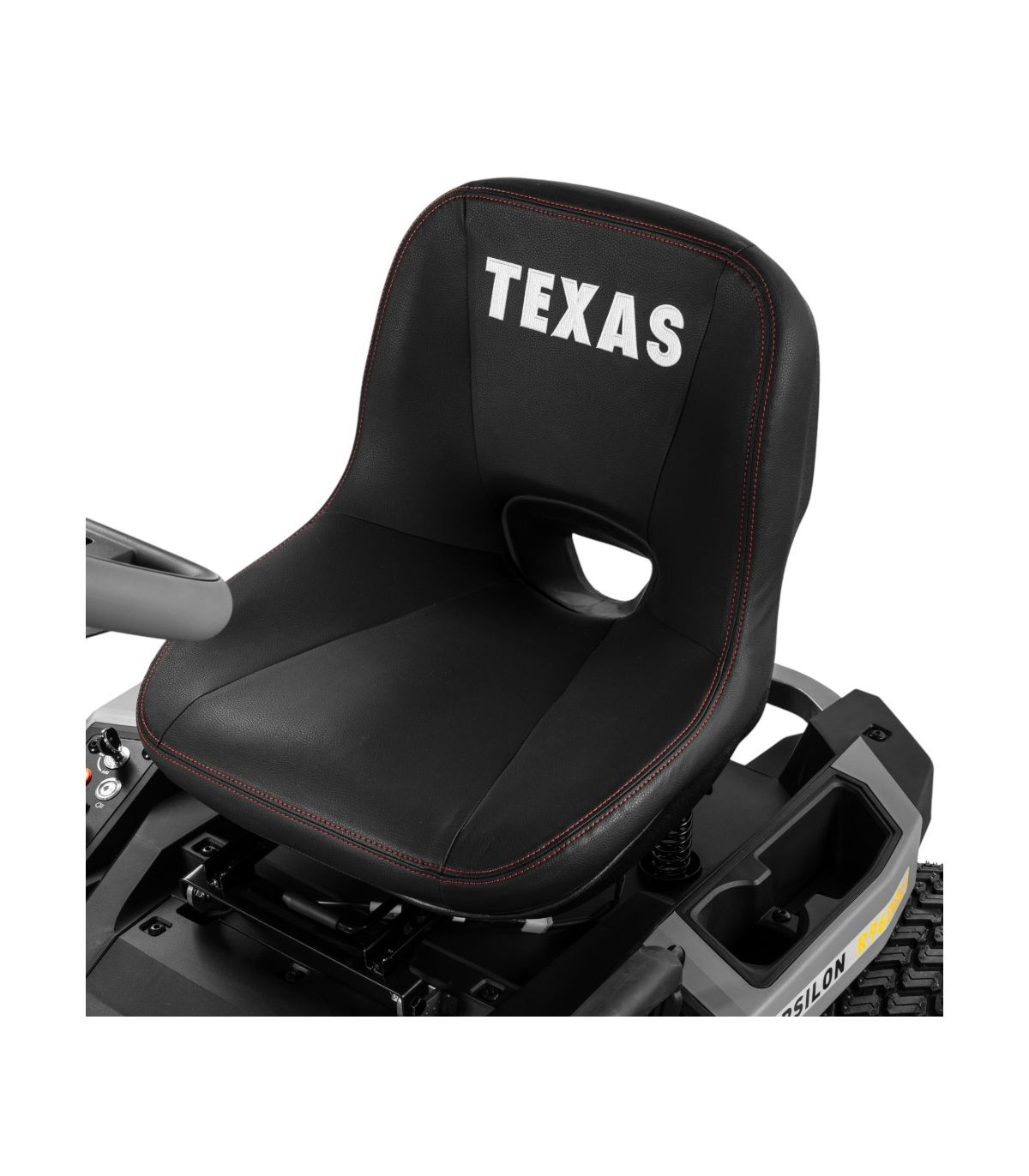 - Tondeuse autoportée électrique TEXAS Epsilon R9600Li, alimentée par une batterie lithium 72V - 27,6 Ah, conçue pour des surfaces jusqu’à 4 000 m² par charge.