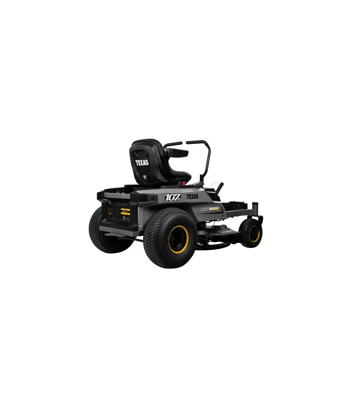 Le tracteur tondeuse TEXAS pèse 172 kg à vide, ce qui garantit une stabilité optimale lors de la tonte. La largeur de coupe de 107 cm permet de traiter rapidement de grandes surfaces tout en restant maniable autour des obstacles grâce à la technologie Zero-Turn. Les roues pneumatiques avant de 13 pouces et arrière de 20 pouces assurent confort et adhérence. Les dimensions exactes du châssis facilitent le stockage en garage ou abri de jardin classique.